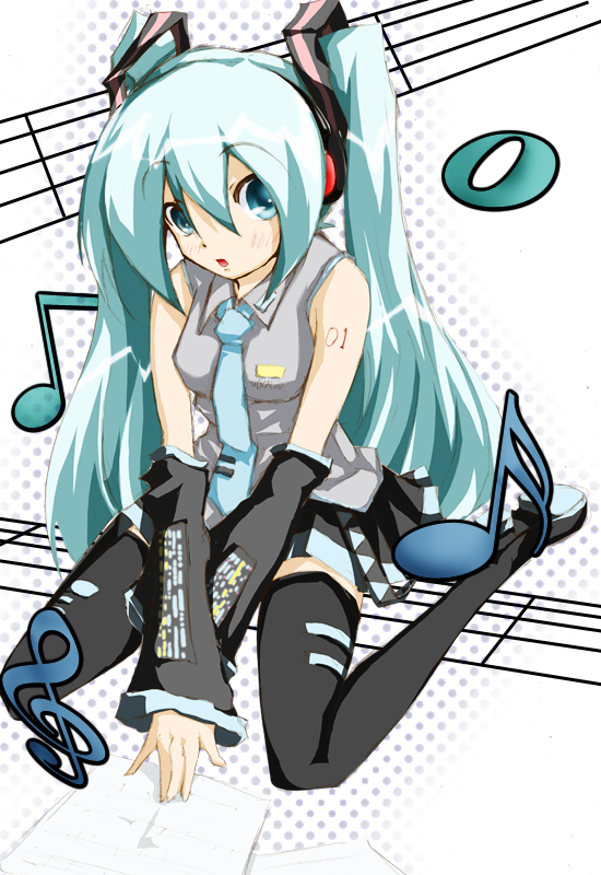 1girlaqua eyesaqua hairdetached sleevesfemale focusmusical notemusical staffnecktiesittingskirtsolothighhighstwintails