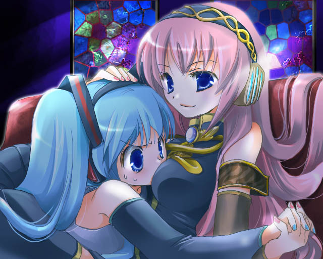 2girlsaqua hairarm warmersbetween breastsblue nailsbreast pressbreastsdetached sleevesmultiple girlsnail polishpink hairpink nailssweatdropyuri