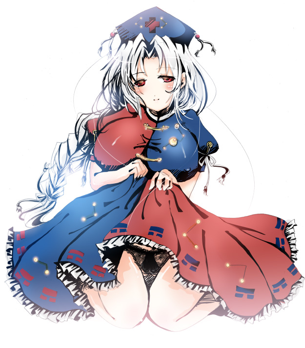 1girlblack pantiesbraidbreastscameltoeclothes liftcovered erect nipplesdressdress liftfemale focushatlacelace trimlace-trimmed pantieslarge breastslong hairnurse cappantiesponytailred eyesshirtsimple backgroundsingle braidsittingsmilesolotaut clothestaut shirtthigh gaptrigramunderwearvery long hairwarizawhite backgroundwhite hair