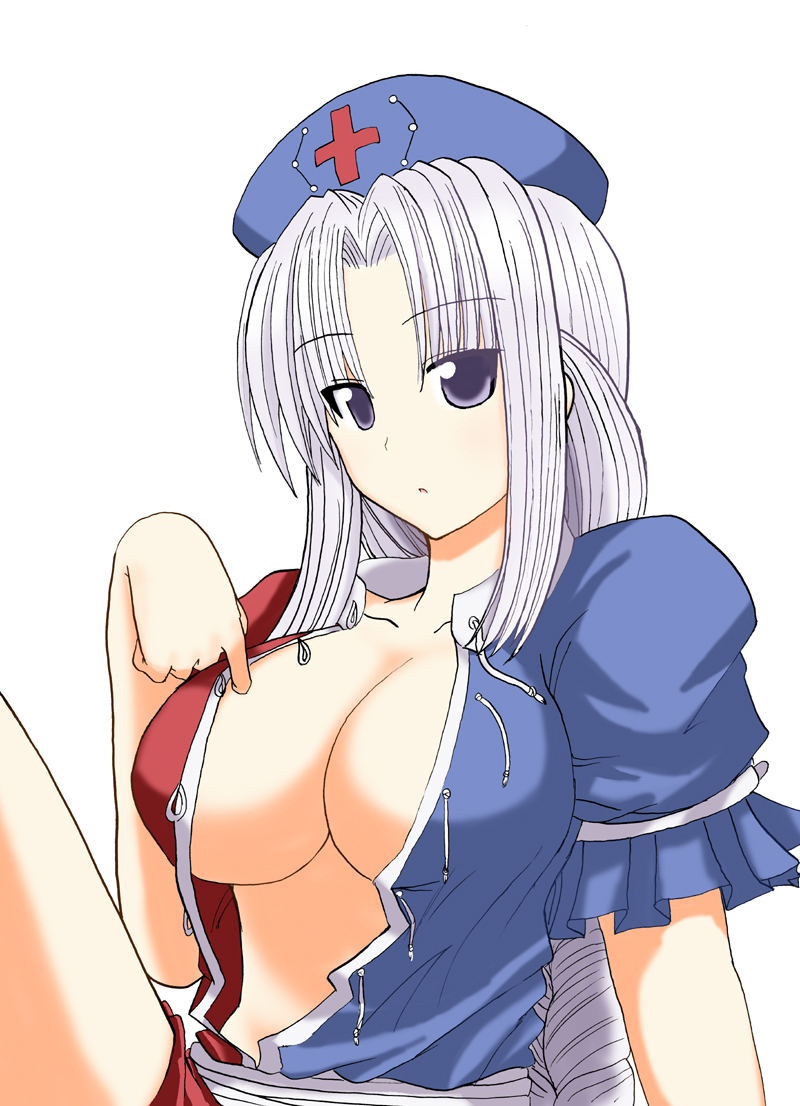 1girlbraidbreastscleavagefemale focushatlarge breastsnurse capopen clothesopen shirtpurple eyesshirtsimple backgroundsingle braidsolowhite hair