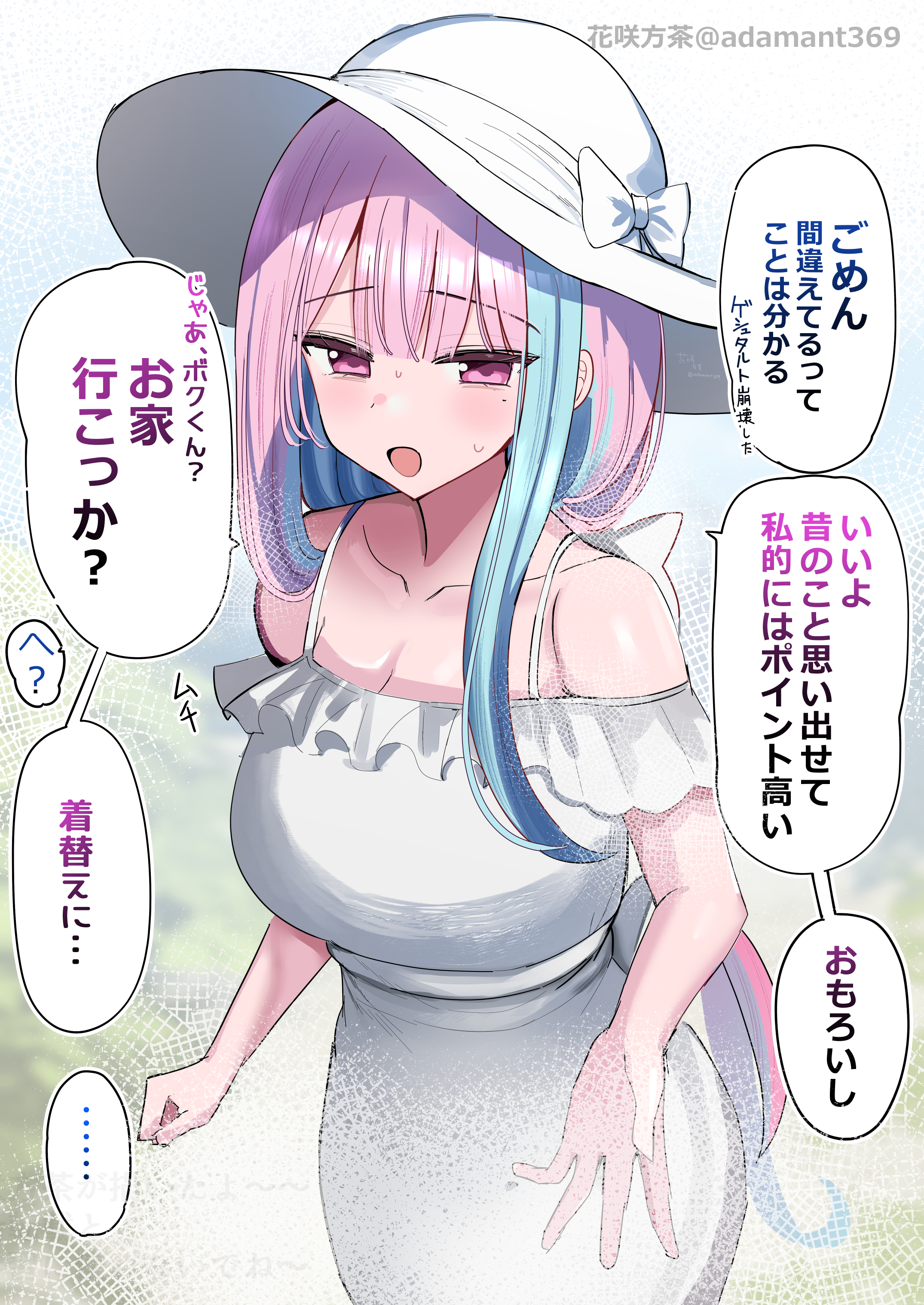 1girlblue hairbreastshair over shoulderhatlarge breastslong hairlooking at viewermulticolored hairopen mouthpink eyespink hairsolotwo-tone hair