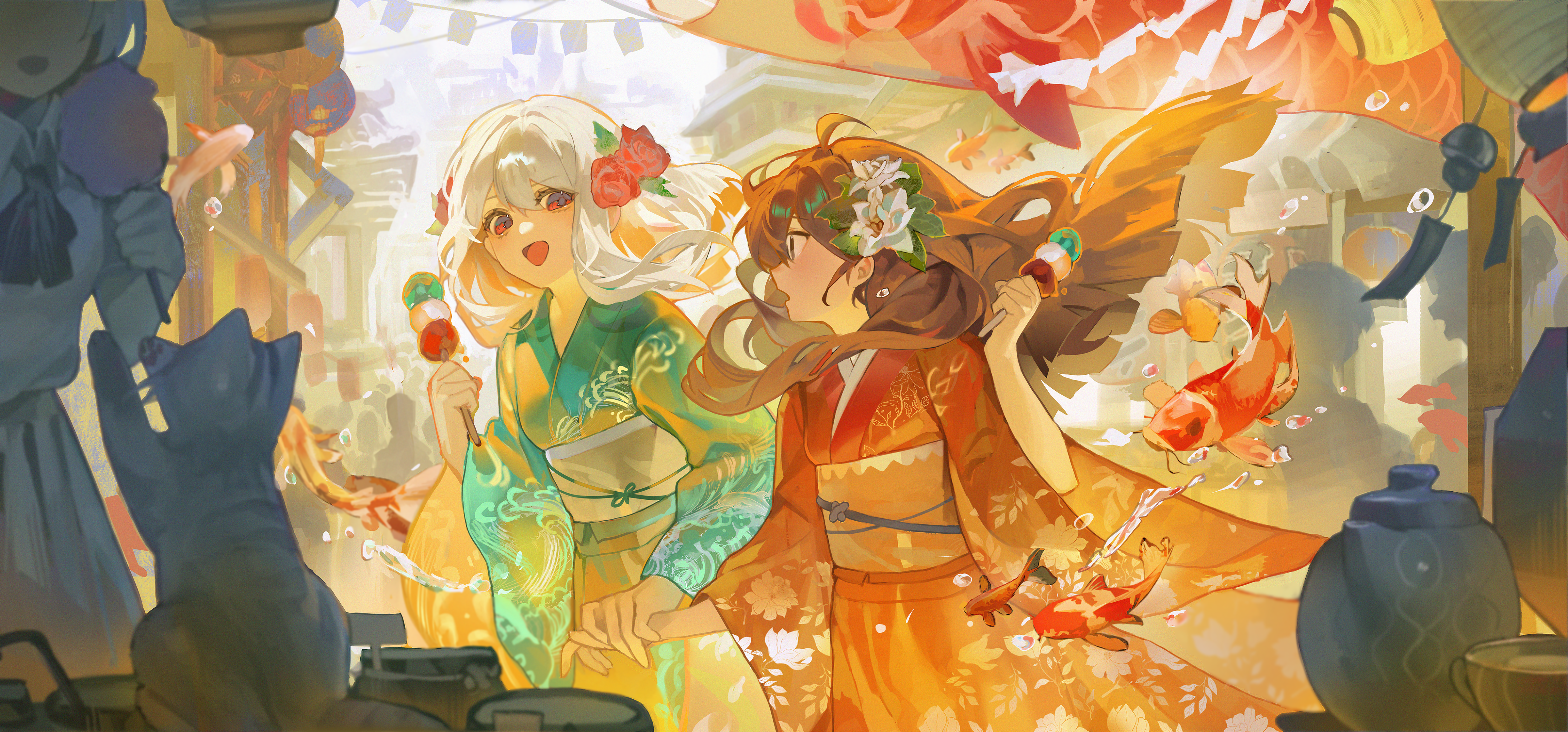 2girlsanimalaqua kimonoblunt endsbrown eyesbrown haircarpcatcrowddangoflowerfoodhair flowerhair ornamentholding handsjapanese clotheskimonokoinoborilong hairlong sleeveslooking at anothermultiple girlsobiopen mouthred carpetred eyesred flowerred kimonosanshoku dangosashwagashiwater dropwhite flowerwhite hairwide sleeveswindsockyellow sash