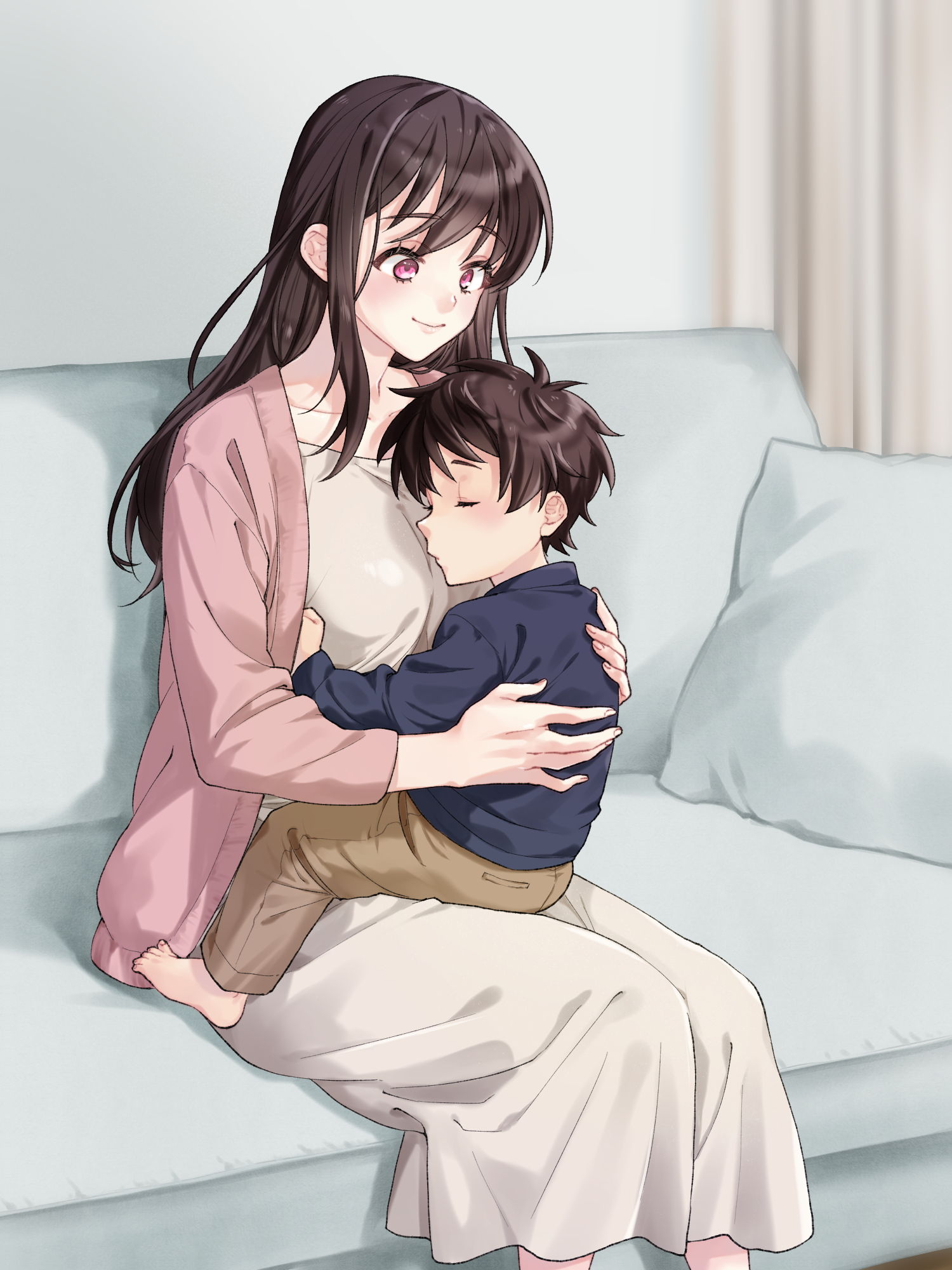1boy1girlbarefootbefore and afterblue shirtbrown hairbrown pantsclosed mouthcouchdressgrey dressindoorslong hairlong sleevesmother and sonon couchpantspillowpink eyesshirtshort hairsittingsitting on lapsitting on personsleepingsmiletoes