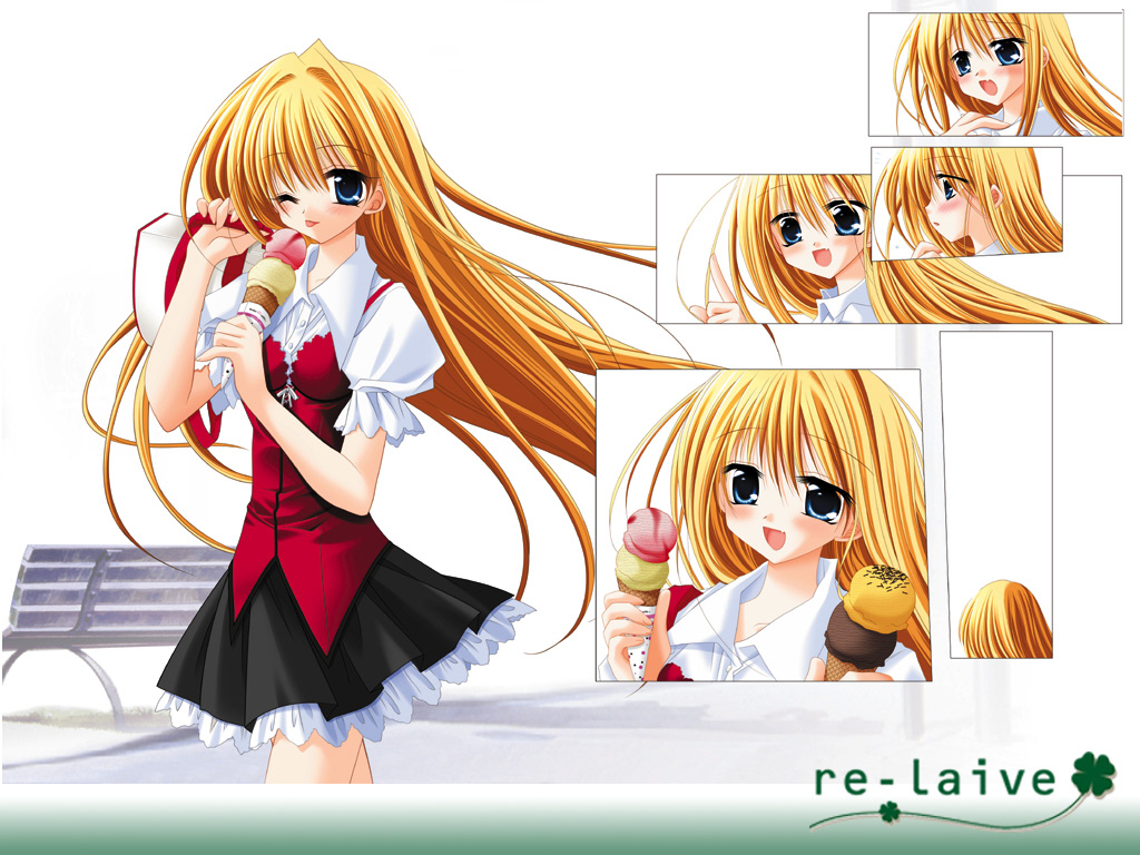 1girlbagblonde hairblue eyesfoodice creamice cream conelong hairone eye closedschool uniformwink