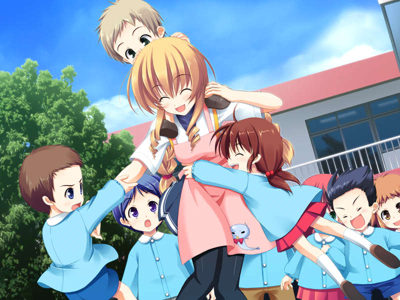2boys4boys5girlsapronblonde hairblue hairbraidbrown haircarryingchildclimbingclosed eyesclouddaydutch anglehair bobbleshair ornamenthappyhugkindergartenkindergarten teacherkindergarten uniformleapinglong hairmultiple boysmultiple girlsopen mouthoutdoorspantyhosepre-schoolpurple eyesschool uniformshoulder carryskysmileteacherteacher and studenttwin braidstwintails