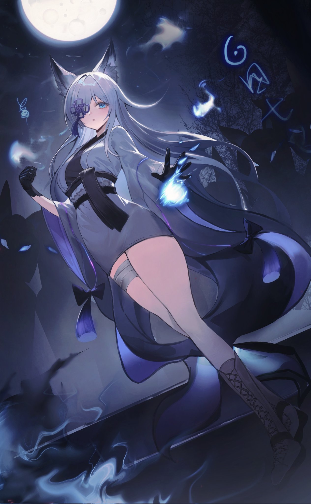 1girlanimal earsbandaged legbandagesbare legsblack glovesblue eyesblue fireblue kimonoblushbootsbreastsclenched handexpressionlessfirefox earsfrom belowfull bodyfull moonglovesglowingglowing eyeshair over one eyehand upjapanese clotheskimonolace-up bootslong hairlooking at viewerlooking downmedium breastsmoonnightnight skyparted lipsshadowskysolostandingstar (sky)starry skythighsvery long hairwhite hair