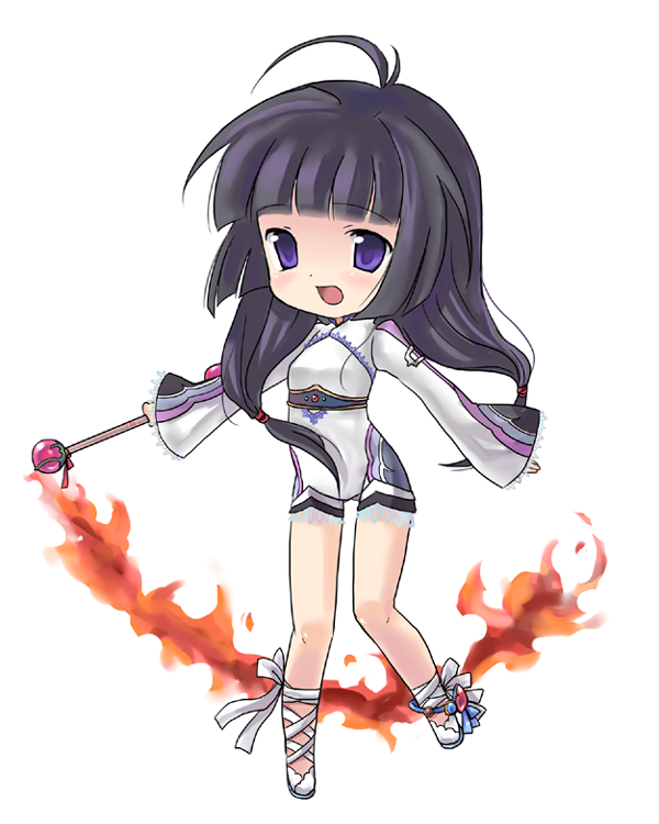 1girlahogeblack hairblue eyesblushchibifemale focusfirelong hairlong sleevesmagicopen mouthribbonrodsolo