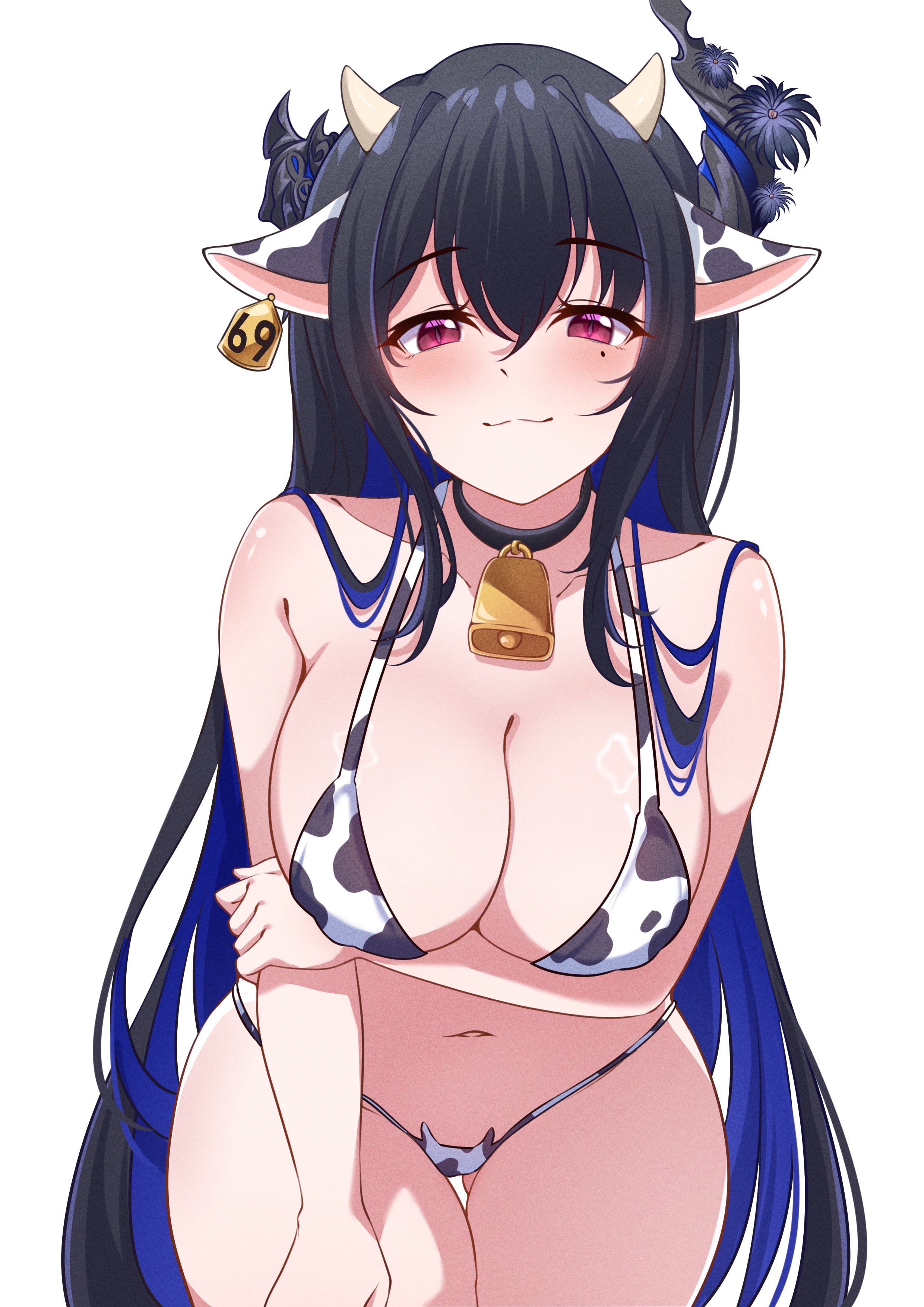 1girlanimal earsanimal printarm under breastsasymmetrical hornsbellbikiniblack chokerblack hairblue hairbreastschokercleavagecow earscow hornscow printcow print bikinicowbelldemon girldemon hornsextra hornsfake animal earsfake hornshornslarge breastslong hairmicro bikinimolemole under eyemulticolored hairnavelprint bikinired eyessimple backgroundsolostomachswimsuittwo-tone hairuneven hornsvery long hairvirtual youtuberwhite background