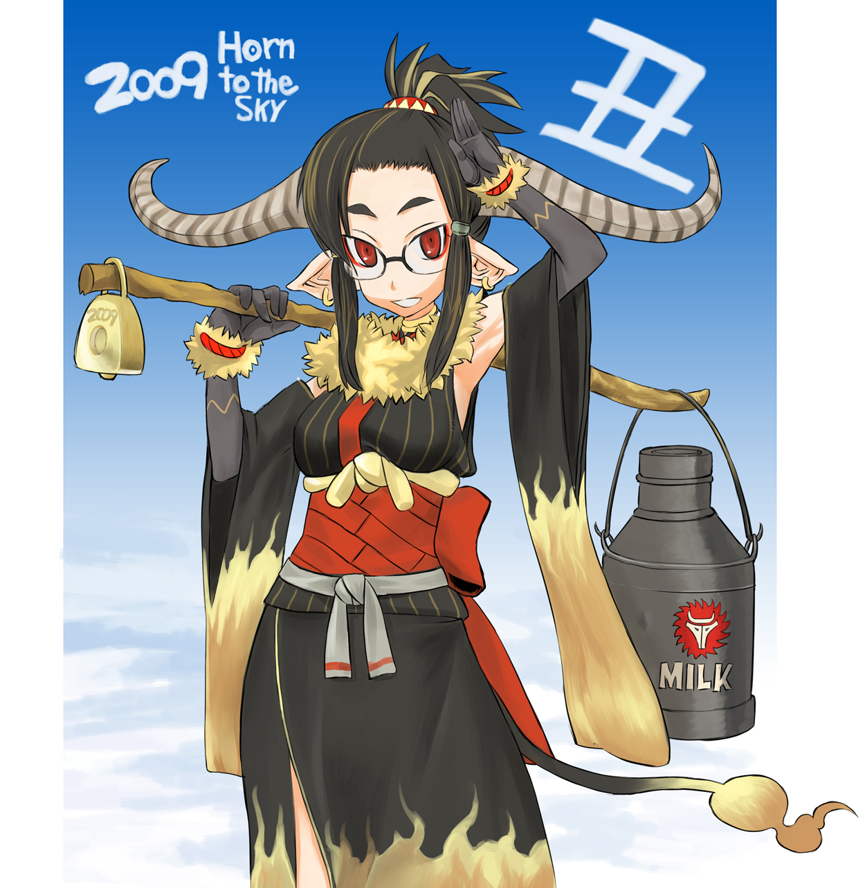 00s1girl2009arm upbellblack haircow girlcowbellearringselbow glovesfemale focusglassesgloveshornsjapanese clothesjewelrymilknew yearover shoulderpointy earsred eyessolotail