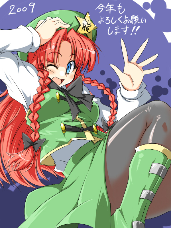 00s1girl2009bootsbraidfemale focusgreen bootskotoyoronew yearone eye closedpantyhosered hairsolotwin braidswavingwink