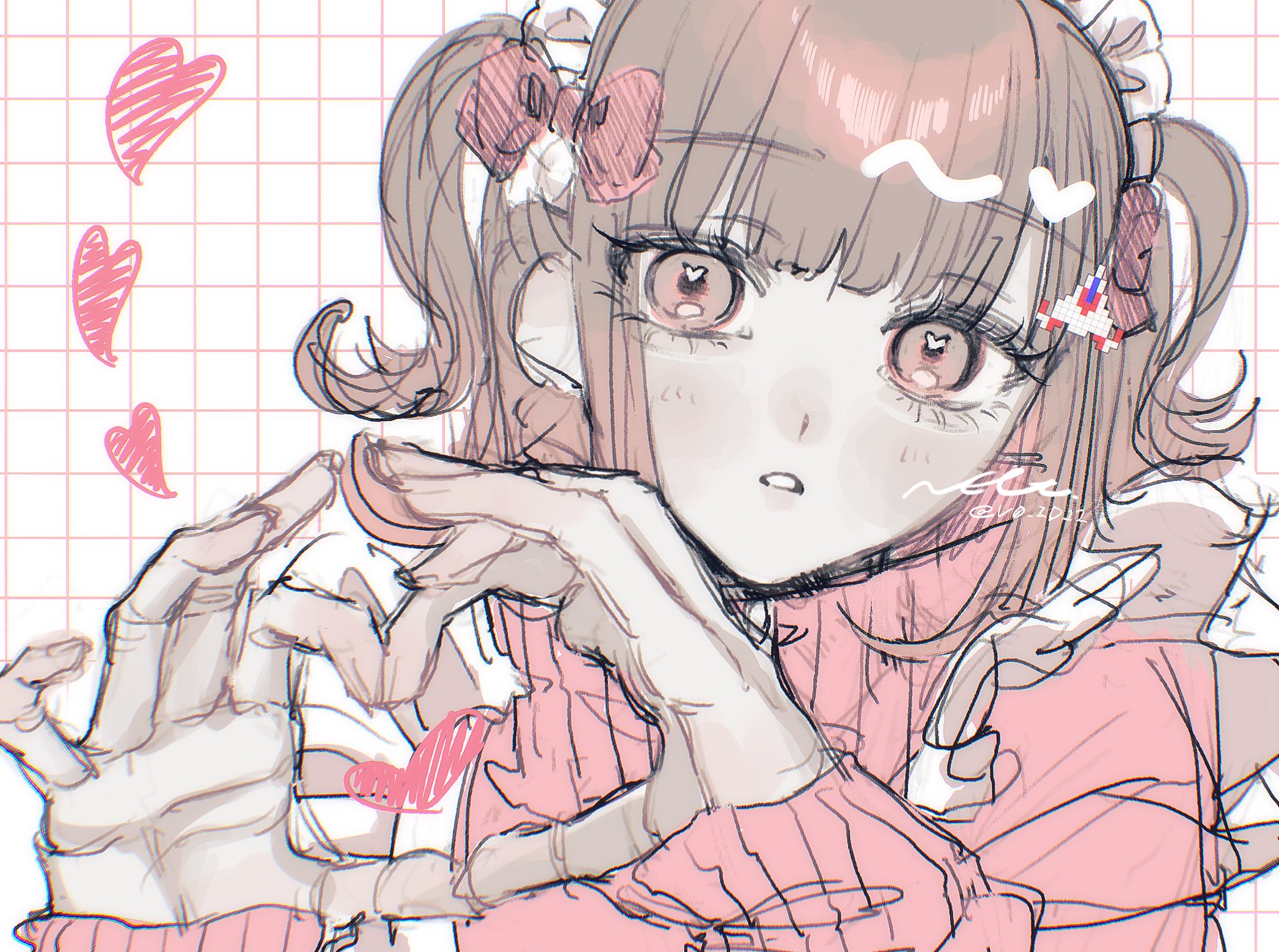 1girlblushbrown hairhands upheartheart handslong sleevesmaid headdressmedium hairpink eyesportraitsimple backgroundsoloteethtwintailswhite background