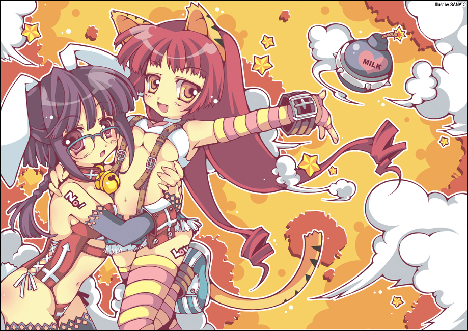 2girlsanimal earsanimal printblack hairblushbombbraidbreastscloudelbow glovesexplosivefanggloveshuglong hairmedium breastsmulticolored glovesmultiple girlsrabbit earsred eyesred hairshortssuspenderstailtank topthighhighstiger printunderboobyellow eyes