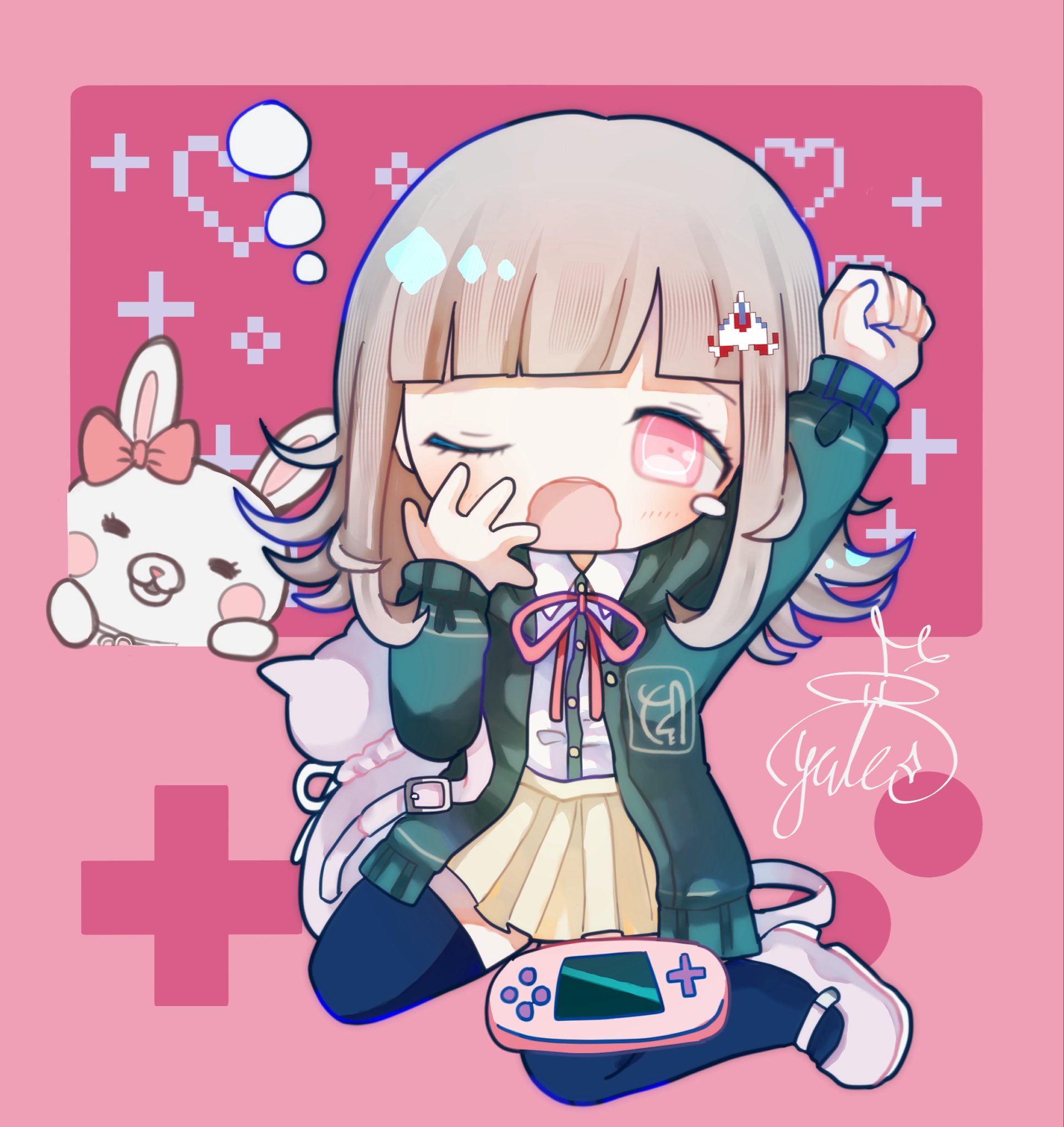 1girlanimal bagarm upblushblush stickersbowbrown haircat bagcollared shirtear bowflipped hairhair ornamenthandheld game consolehoodjacketlong sleeveslooking at viewermedium hairneck ribbonopen clothesopen jacketpink bagpink eyespink ribbonpleated skirtribbonshirtskirtthighhighswhite shirtyawningyukimaru dayo