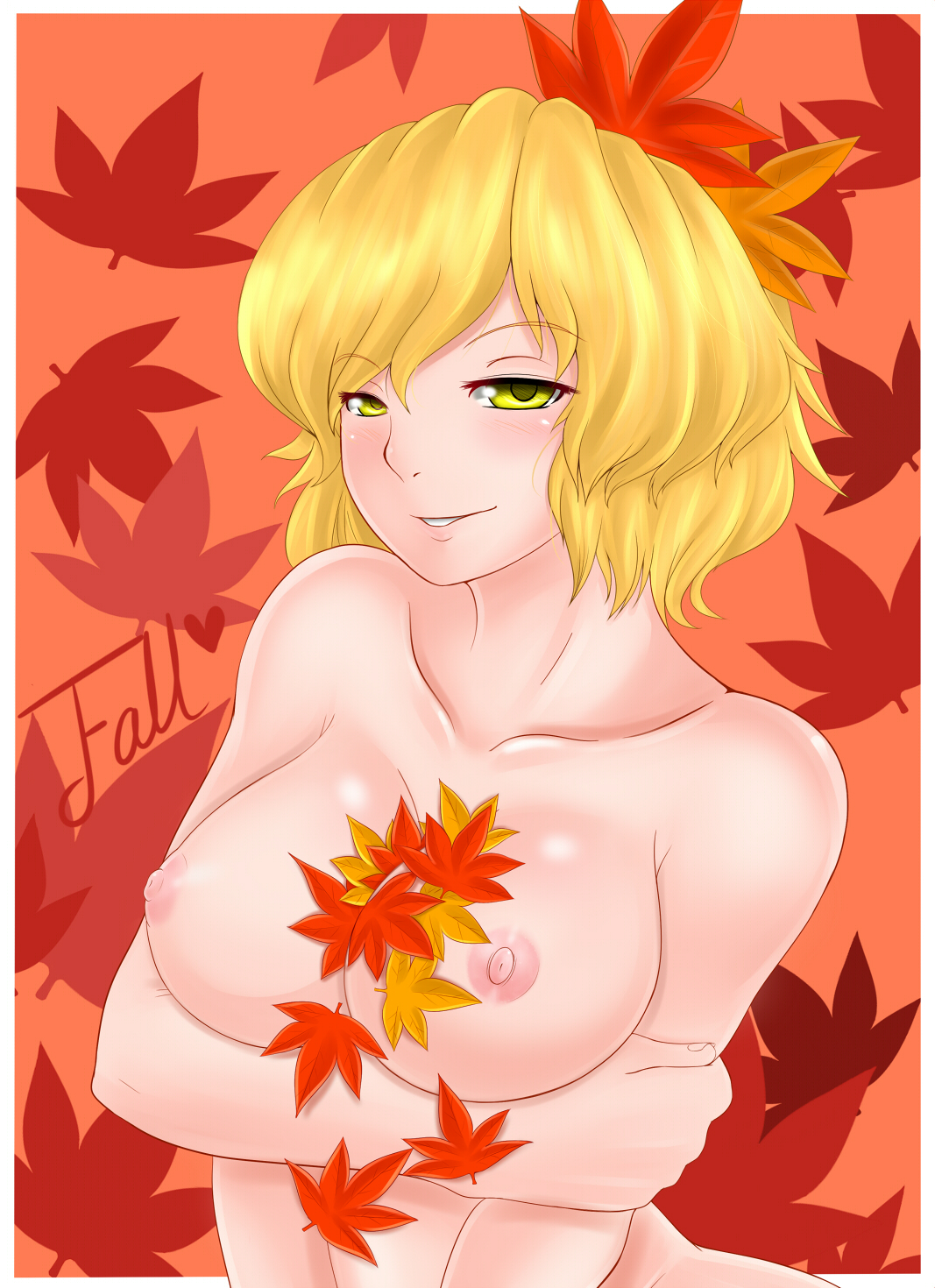 hijiri rei, original, lowres, 1girl, black eyes, black hair, breasts, completely nude, female focus, medium breasts, nipple slip, nipples, nude, short hair, simple background, solo, topless female, yellow background