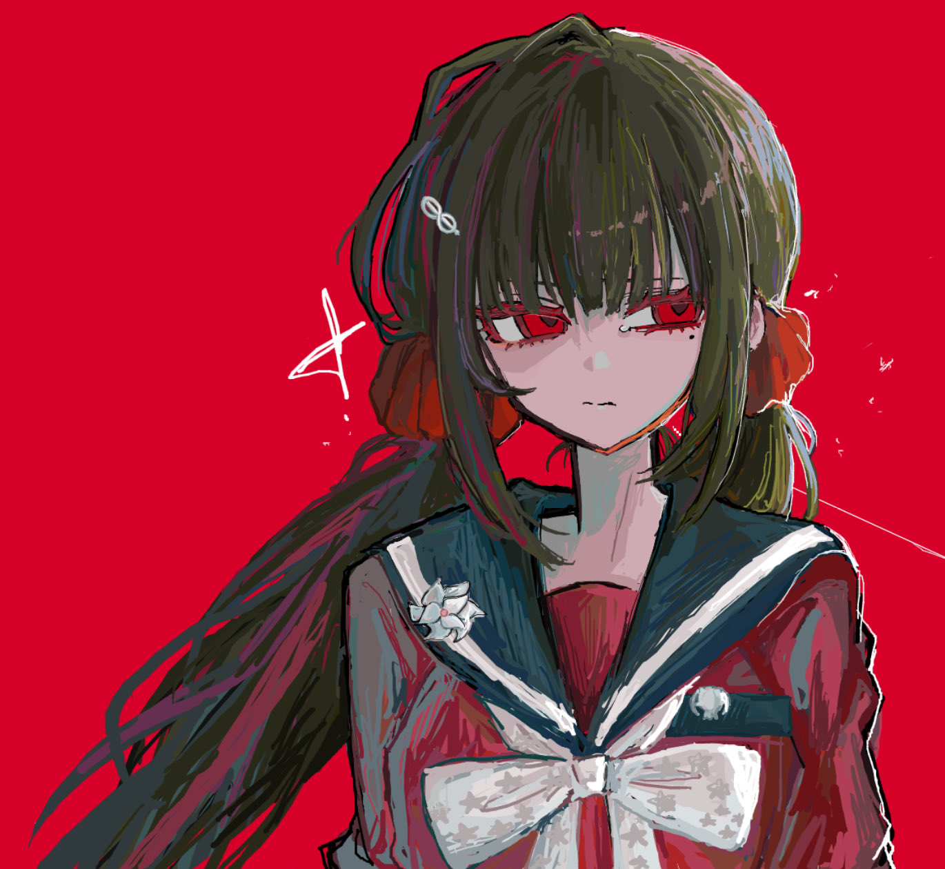 rano u rabe, mitama ruri, emil chronicle online, highres, 1girl, black hair, blue kimono, hair ornament, japanese clothes, kimono, long hair, open mouth, red eyes, solo, sphere hair ornament, twintails, upper body, white hair
