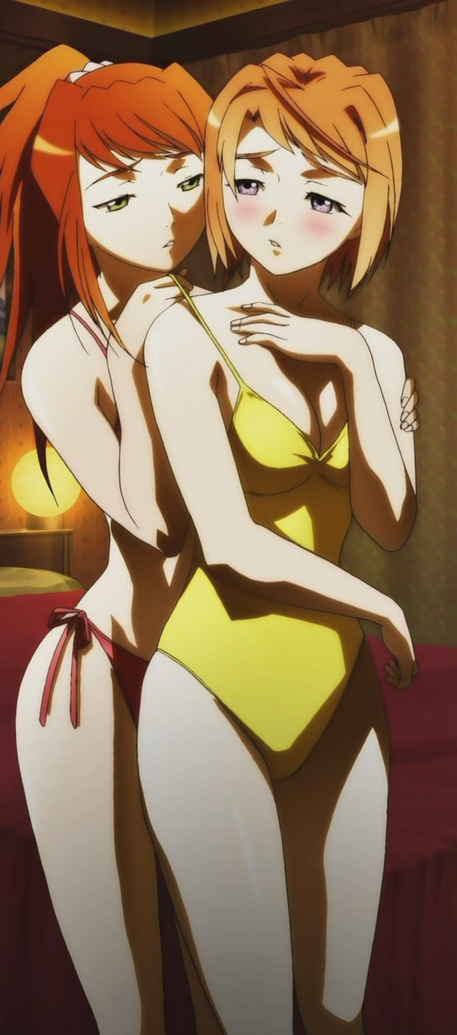 komatsu eiji, highres, 2girls, :p, ass, bikini, bikini pull, bikini tan, butt crack, clothes pull, face in ass, grabbing another's ass, groping, head on ass, looking at viewer, multiple girls, pulling another's clothes, swimsuit, tan, tanline, tongue, tongue out, undressing, yuri