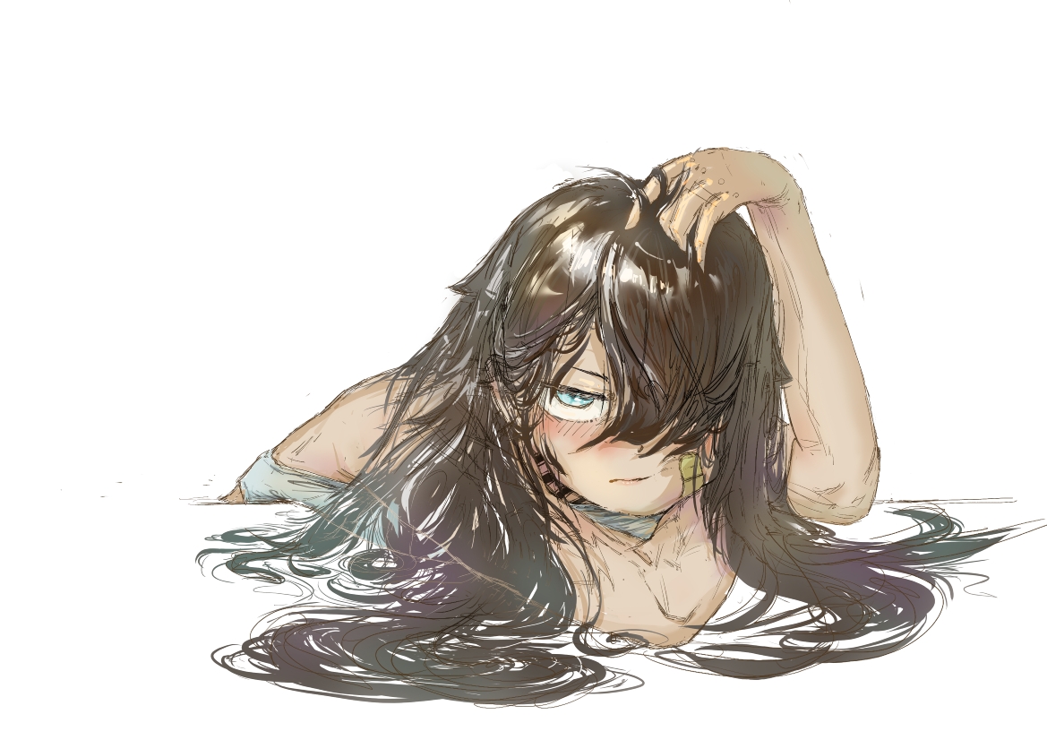 1girlbandaidbandaid on faceblack hairblue eyesblushdark skindark-skinned femalehair over one eyeleaning forwardlong hairlong2er1looking at viewermessy hairneck tattoosimple backgroundsolotank toptattoowhite backgroundwhite tank top