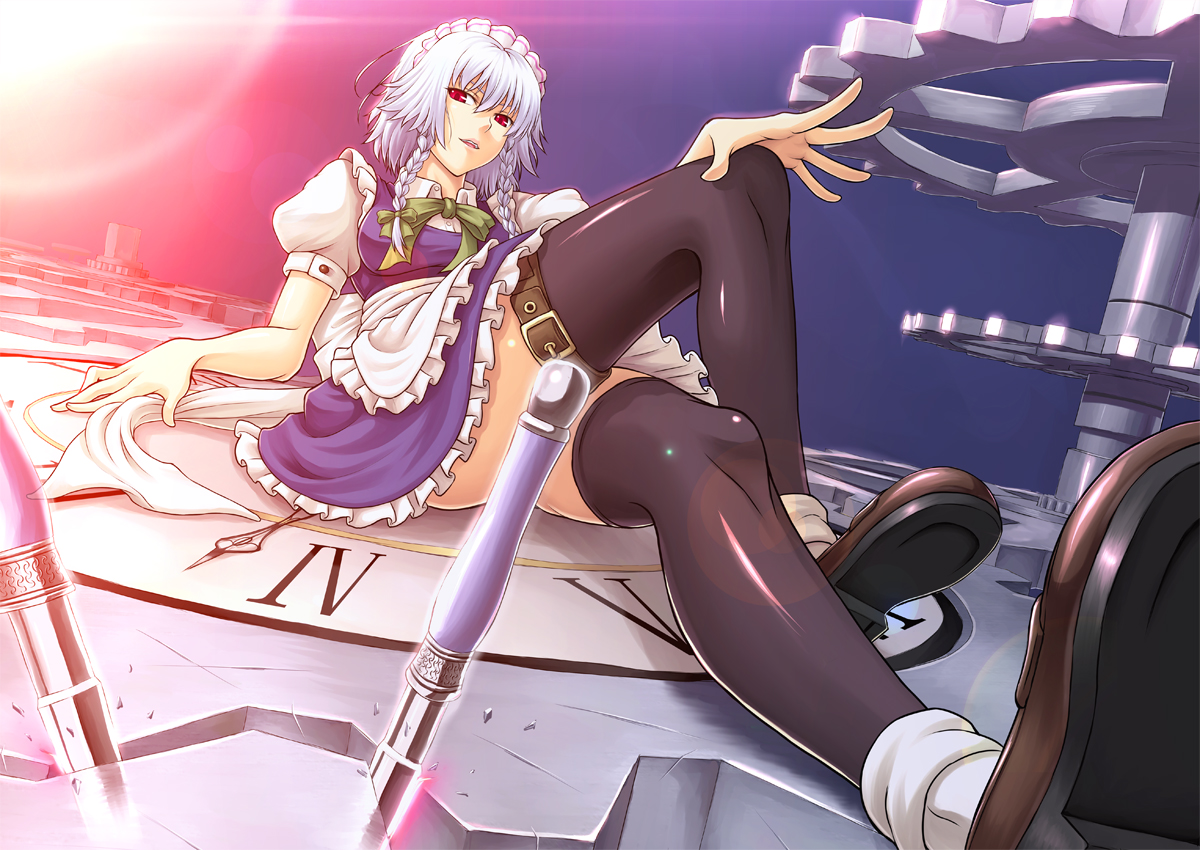 1girlbraidcensoredclockclockworkconvenient censoringcrossed legsfemale focusforeshorteningfrillshand on own kneeknifelyingmaidon backred eyessittingsolothighhighsthrowing knifetwin braidsweaponwhite hair