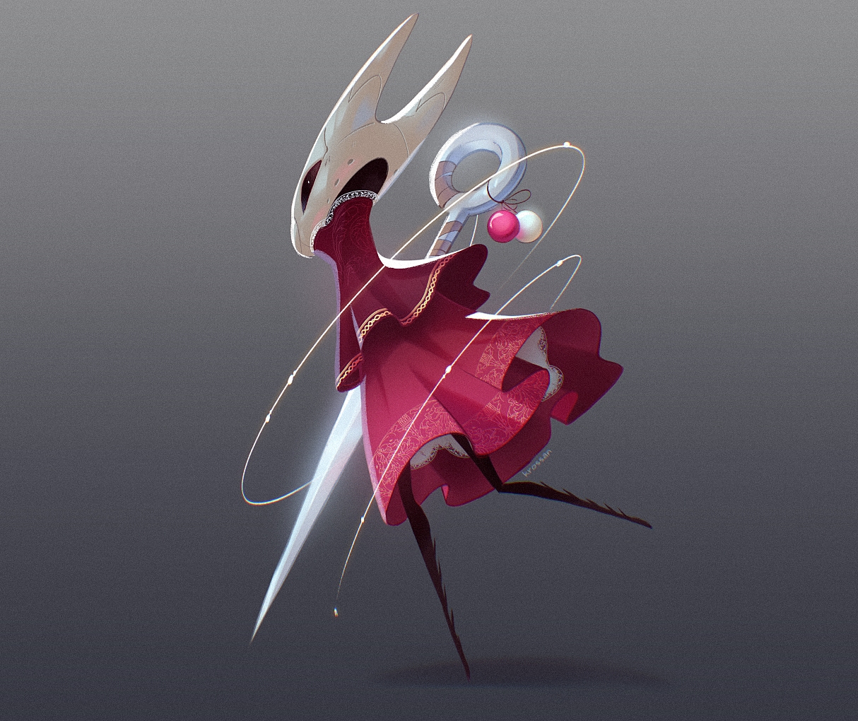 1girlarthropod girlartist nameblack eyesblack skincloakcolored skinfull bodygradient backgroundgrey backgroundholdinghorned maskhornsmaskneedle (hollow knight)red cloaksolowalkingweapon