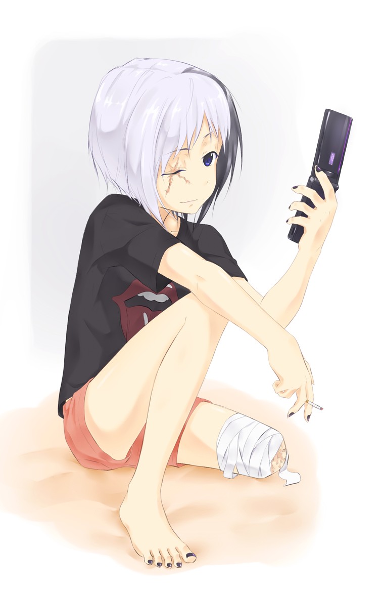 1girlamputeebandagesbarefootblack hairblack nailsblue eyescellphonecigarettefeetfemale focusgrey hairmulticolored hairnail polishone-eyedphonescarscar across eyescar on faceshirtshort hairshortssittingsmokingsolot-shirttoenail polishtoenailstwo-tone hair