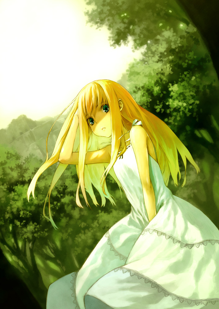 1girladjusting hairblonde hairblue eyesdressfemale focusflat chestforestgreen eyeslong hairnaturesolowhite dresswind