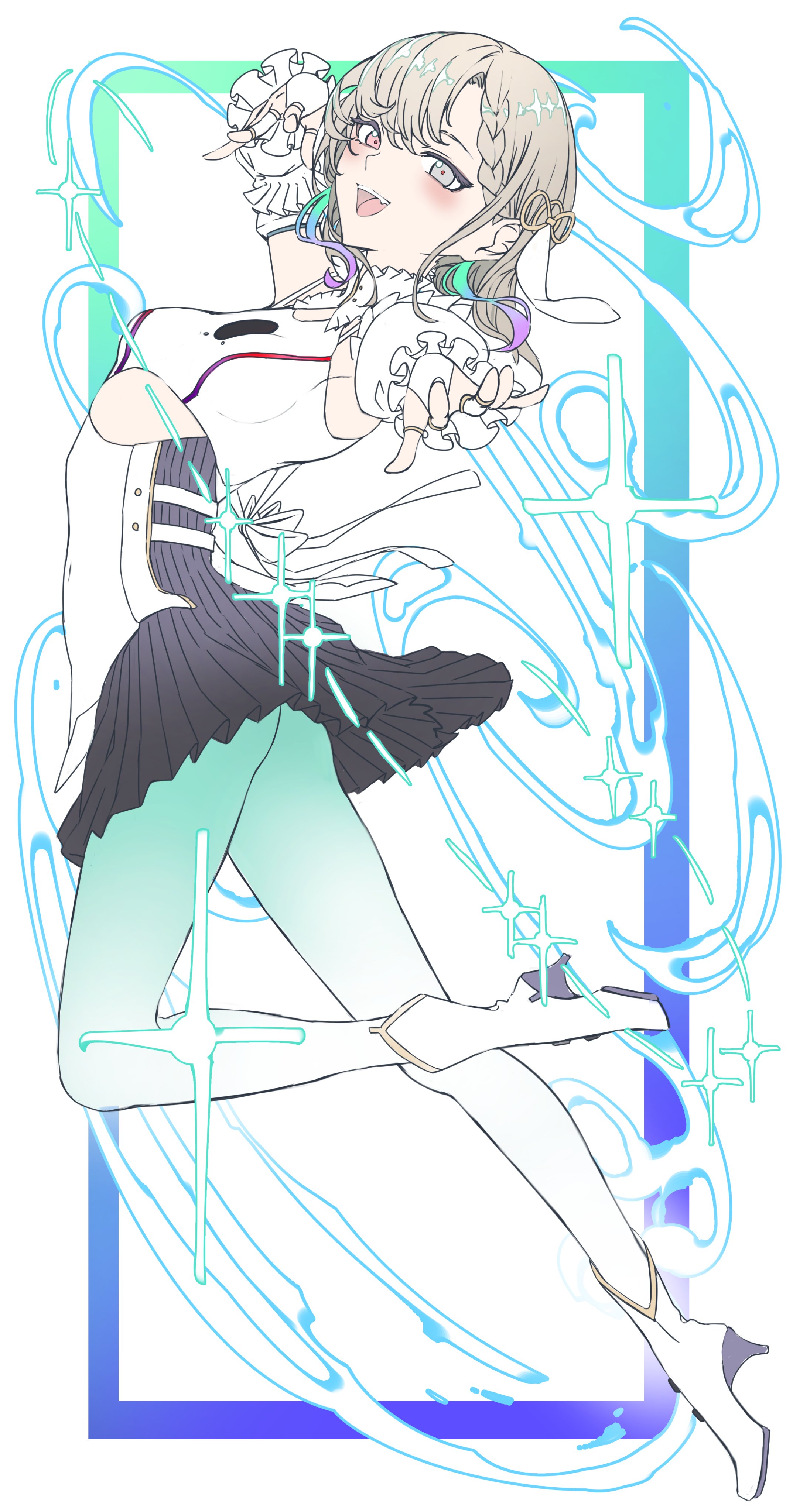 katu chicken, m37 (girls' frontline), shizuko (blue archive), blue archive, commentary request, highres, 1girl, apron, bell, belt, black belt, blush, bow, brooch, brown hair, floral print, floral print kimono, frilled apron, frilled kimono, frills, green background, gun, gun on back, hair bell, hair ornament, halo, hand on own cheek, hand on own face, heart, heart brooch, holding, holding plate, japanese clothes, jewelry, jingle bell, kanzashi, kimono, kimono skirt, long hair, looking at viewer, maid, maid headdress, open mouth, pink bow, pink halo, plate, print kimono, pump action, purple eyes, shide hair ornament, shotgun, silhouette, simple background, smile, solo, sparkle, sparkling aura, teapot, two side up, wa maid, waist apron, weapon, weapon on back, white apron
