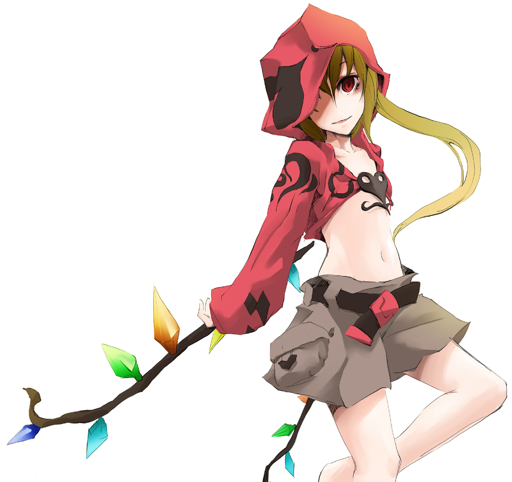 1girladapted costumealternate costumeblonde haircontemporaryfemale focusflat chesthoodhooded jackethoodiejacketmidriffno noseone-eyedred eyesshortsside ponytailsimple backgroundsolowings