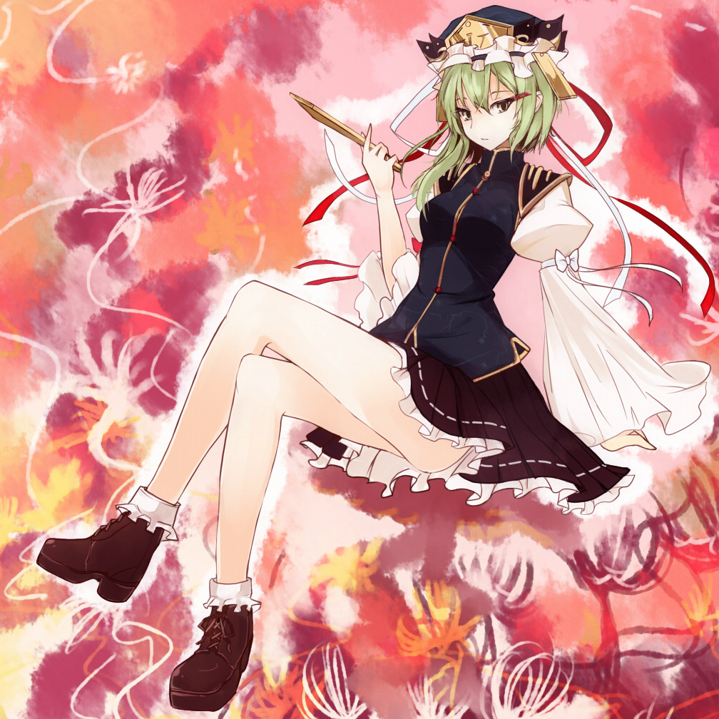 1girlasscrossed legsfemale focusflowerfull bodygreen hairhatlegsplantred flowerrod of remorsesittingsolospider lilyyellow eyes