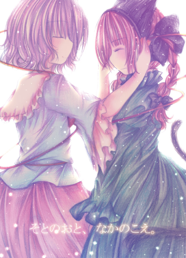 2girlsblushcat tailclosed eyesfemale focushand on another's cheekhand on another's facehand on own cheekhand on own facelight particleslong hairmultiple girlsprofilepurple hairred hairshort hairtail
