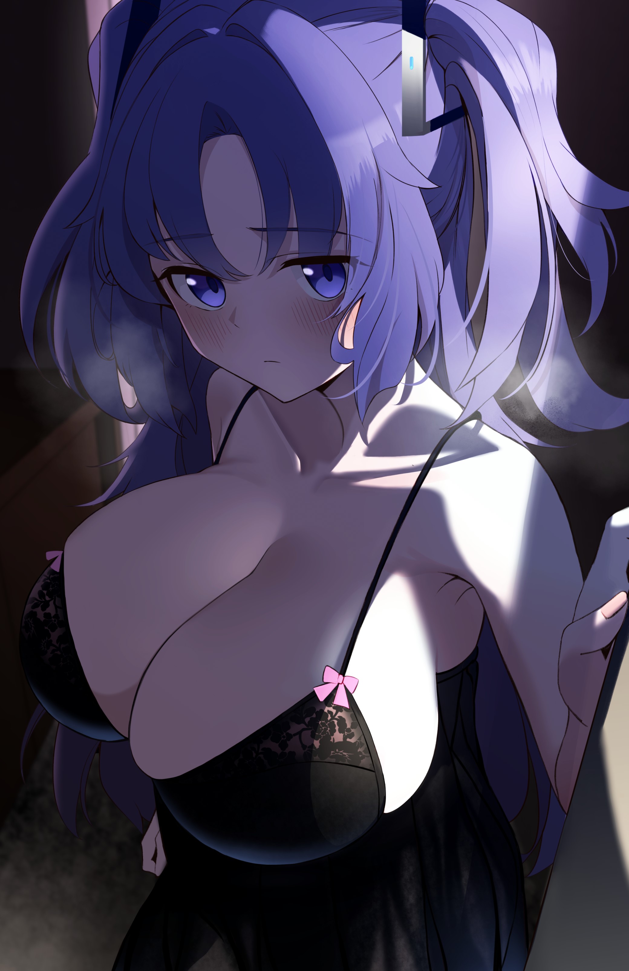 1girlbabydollblack babydollblushbreastshair ornamentlarge breastslong hairlooking at viewerpurple eyespurple hairsidelockssolotwo side up