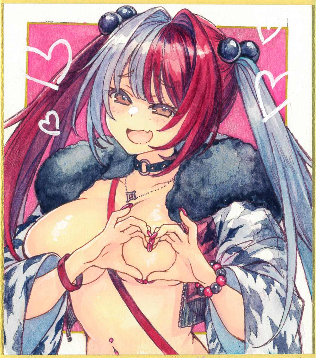 1girlblushbreastschokerfur collarhair bobbleshair ornamentheartheart handsjacketjewelrylarge breastslong hairlong sleeveslooking at viewermulticolored hairnaked jacketnavelnavel piercingnecklaceopen mouthpiercingred eyesred hairred jacketsmilesolosplit-color hairtwintailswhite hairwhite sleeveswide sleeves