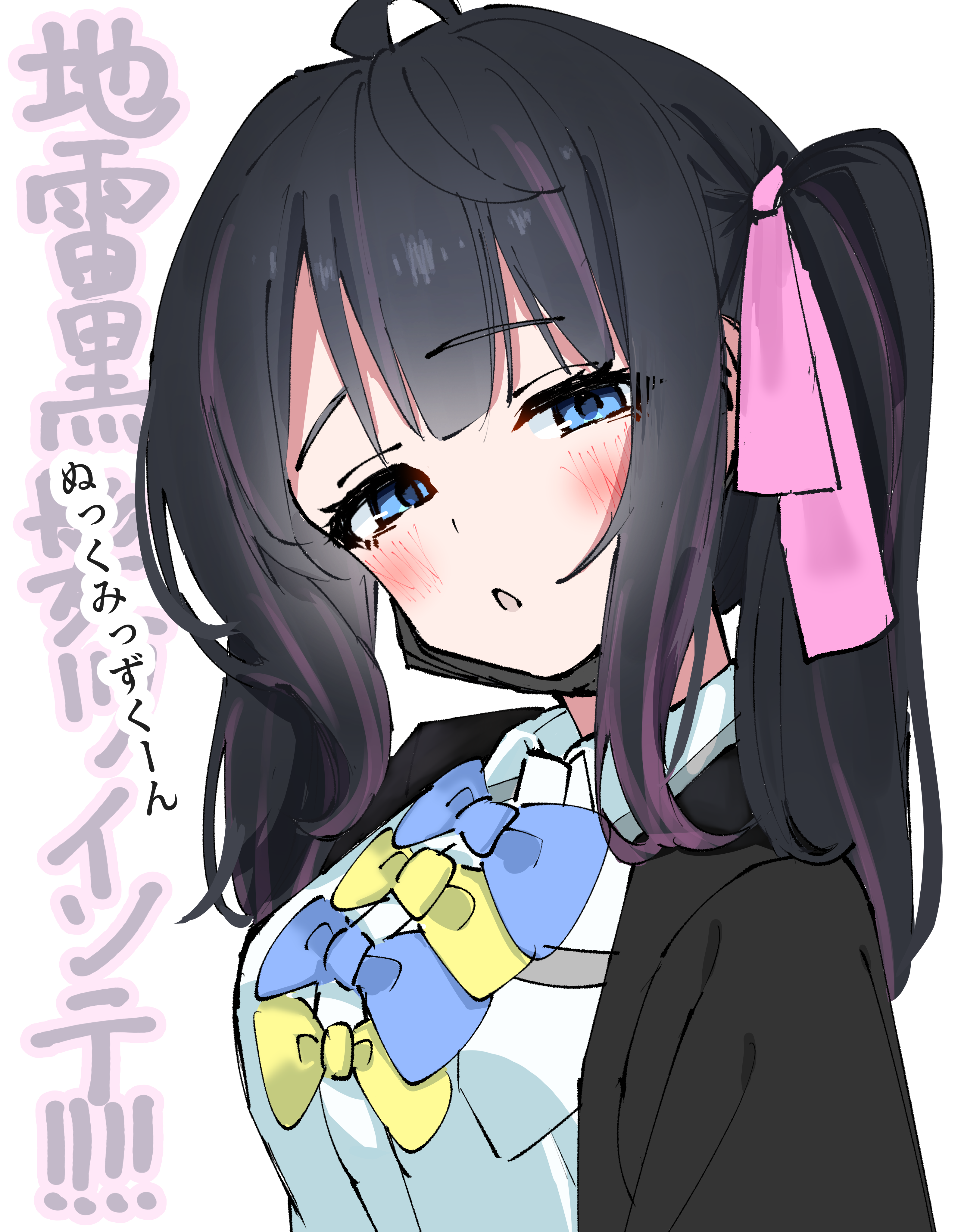 :o1girlahogealternate hair coloralternate hairstyleblack hairblack jacketblue bowblue eyesblushbowhair ribbonjacketlooking at viewermedium hairmulticolored hairribbonschool uniformshirtstreaked hairtwintailswhite backgroundwhite shirtyellow bow