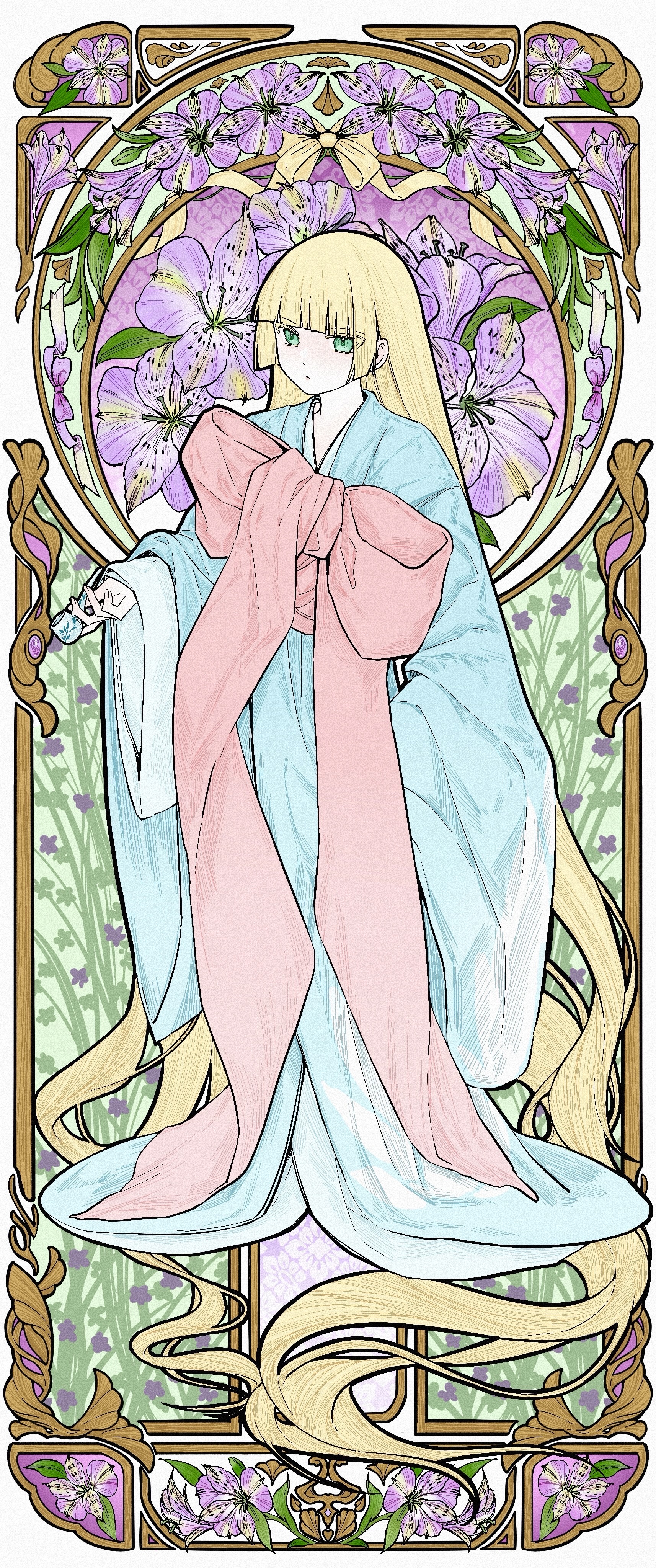 1girlaqua kimonoart nouveaublonde hairblunt bangsblunt sidelocksbowclosed mouthflat colorfull bodygreen eyesjapanese clotheskimonolong hairlooking aheadpink bowpink sashpurple hairsashsidelockssmoking pipesolovery long hairwide sleeves