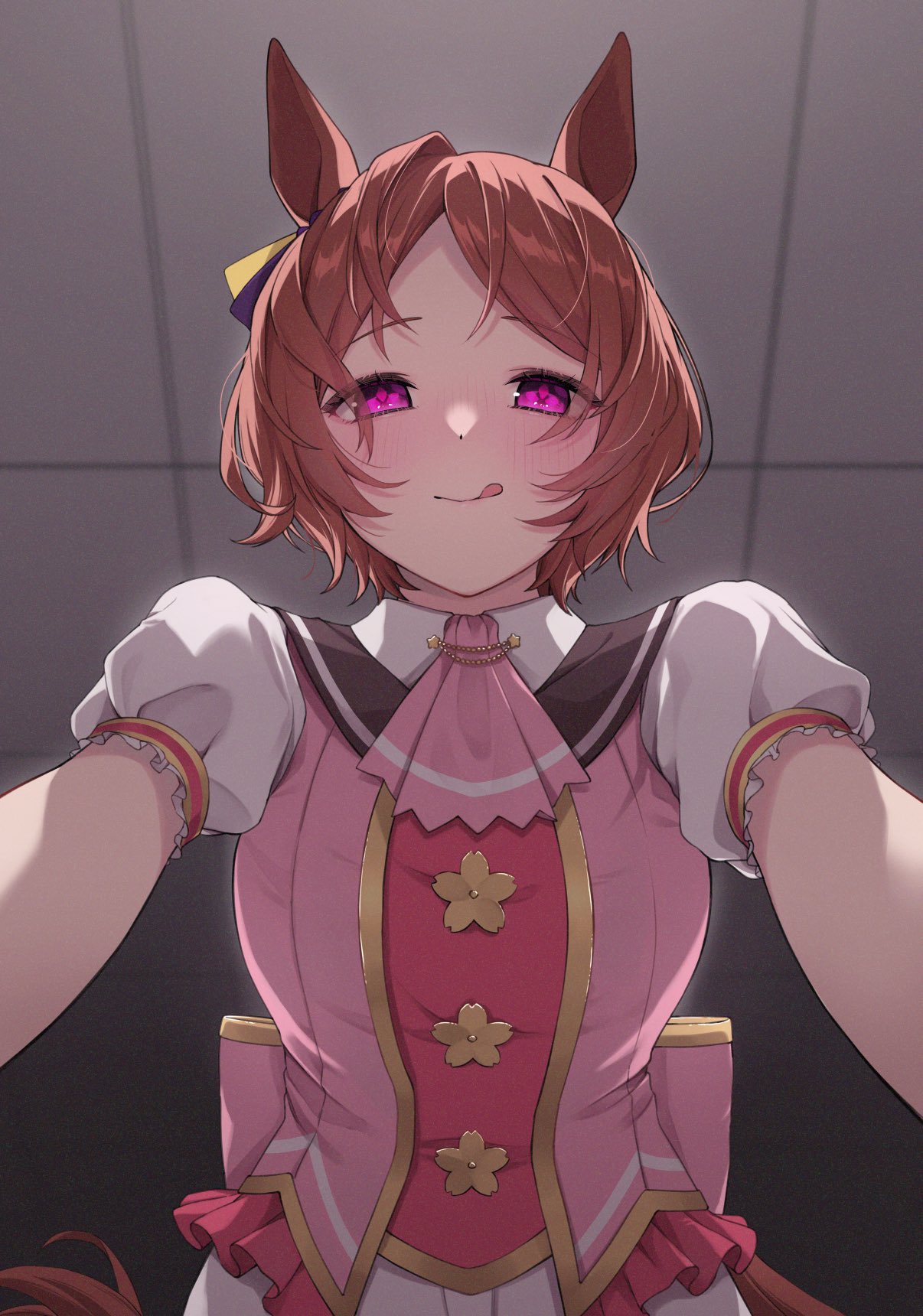 :q1girlanimal earsascotblushbrown hairceilinghorse earshorse girlhorse taillooking at viewerparted bangspink ascotpovpuffy short sleevespuffy sleevespurple eyesshort hairshort sleevessmilesolotailteethtile ceilingtilestonguetongue outupper teeth onlyyukadon on viewer