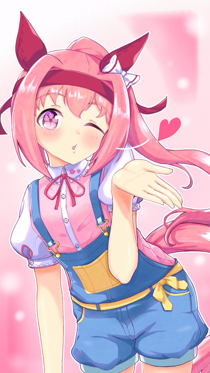 1girlanimal earsblowing kissblushbowear bowear coversflower in eyeflower-shaped pupilshairbandheadbandhorse earshorse girlhorse taillong hairlooking at vieweropen mouthpink eyespink hairpink headbandponytailred headbandshirtsolosymbol in eyesymbol-shaped pupilstail