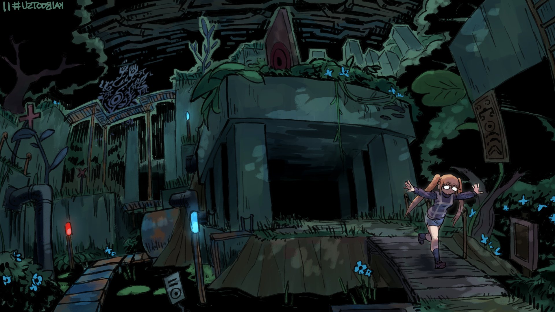 1girlabstract backgroundalternate hair coloralternate hair lengthalternate hairstyleartist namebespectacledblack socksblue flowerbridgebrown hairbrown shoesflowerglassesgrey skirtin-universe locationkneehighsminiskirtoutdoorsoutstretched armsparted lipspencil skirtrunningshoesskirtsockssolotreetwintailswooden bridge