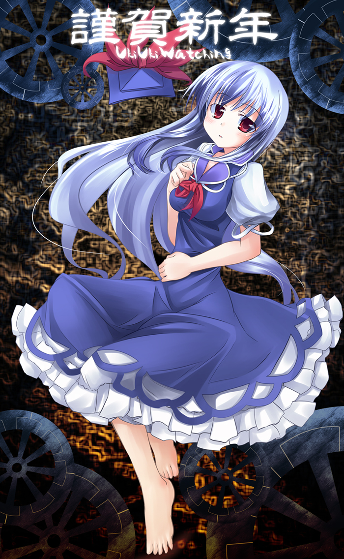 1girlbarefootblue hairbreastsfeetfemale focusfull bodylong hairnew yearred eyessolovery long hair