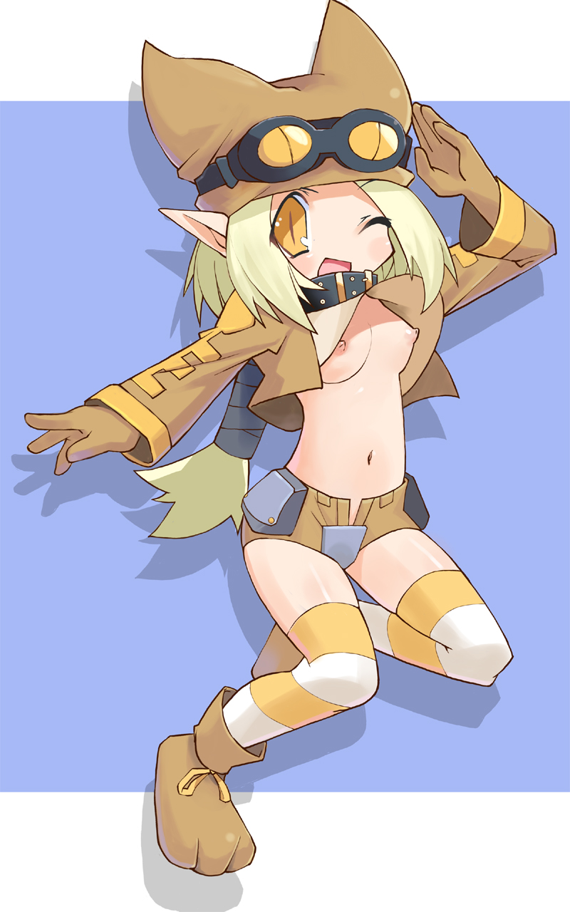 1girlanimal handsanimal hatblonde hairblushbreastsbrown shortsclothes liftcollarfemale focusglovesgoggleshatlong hairlong sleevesnavelone eye closedopen mouthpointy earsponytailshirt liftshortssmall breastssmilesolostriped clothesstriped thighhighsthighhighswinkyellow eyes