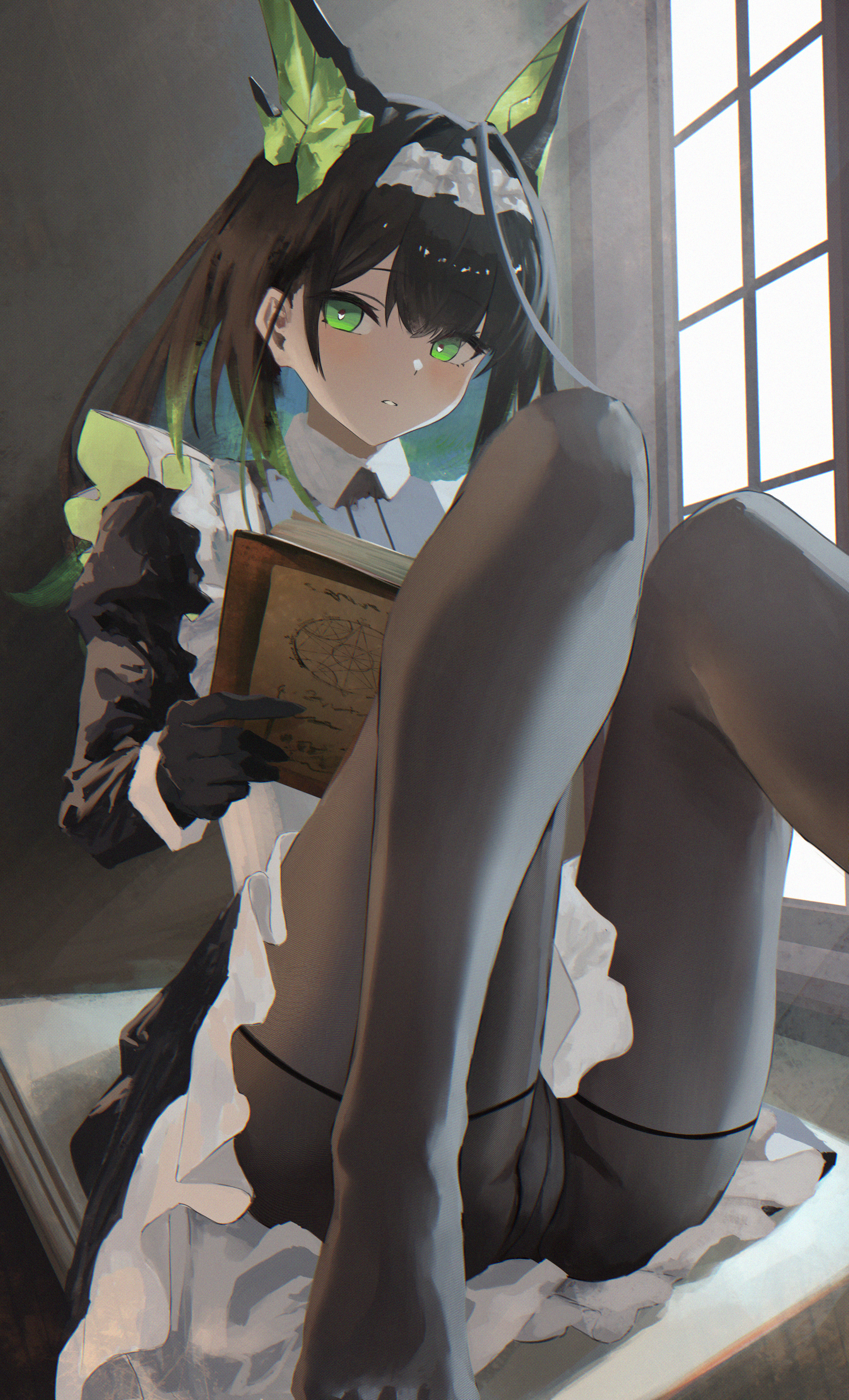 1girlanimal earsapronblack dressblack hairblack pantyhosebookcat earsdressgreen eyesgreen hairholdingholding bookindoorsknees uplooking at viewermaidmaid apronmedium hairmulticolored hairno shoespantiespanties under pantyhosepantyhosesittingsolotoestwo-tone hairunderwearwhite apron