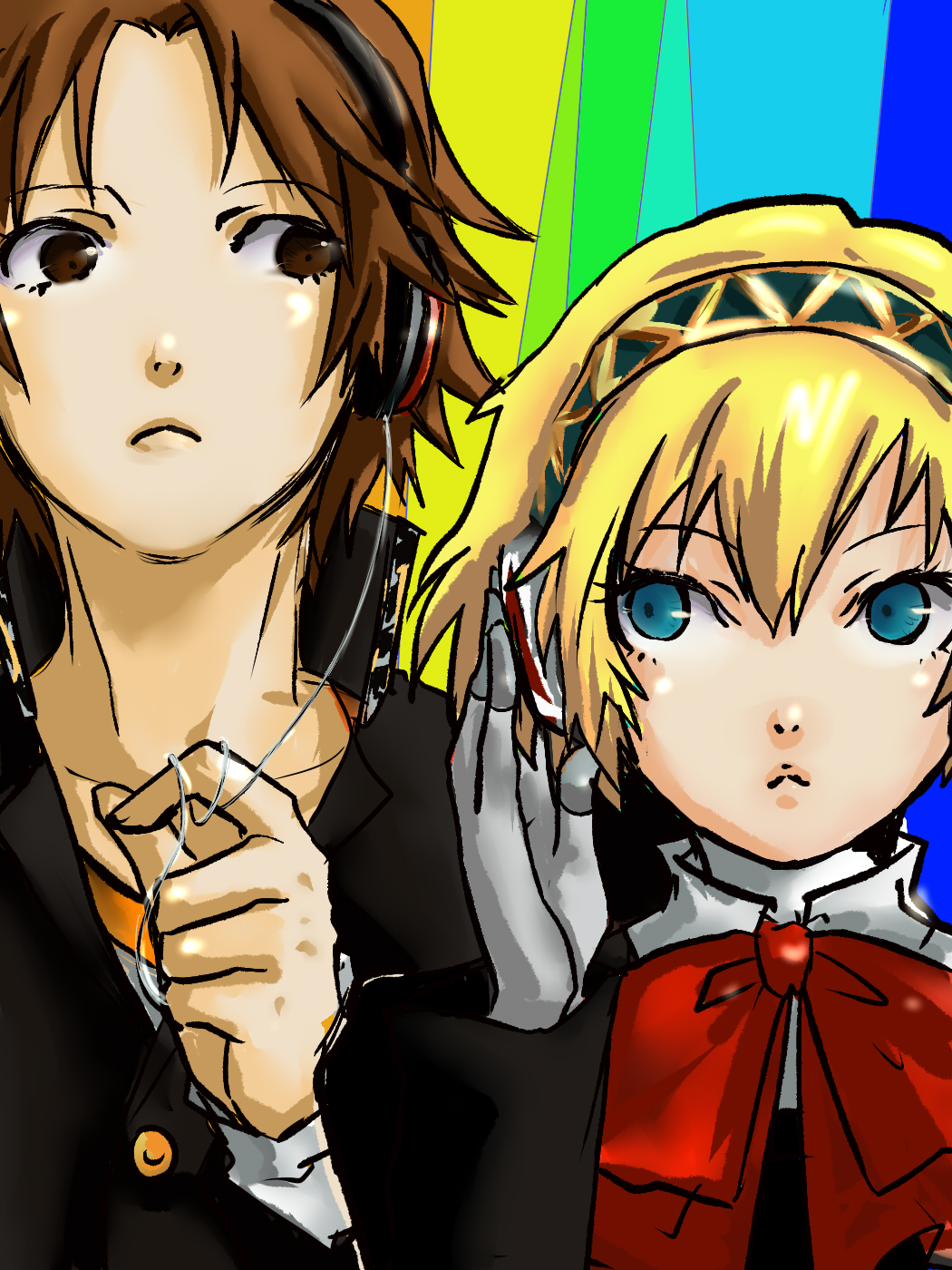 1boy1girlblonde hairblue eyesbrown eyesbrown hairbuttonscrossoverheadphonesribbonschool uniformshirtt-shirt
