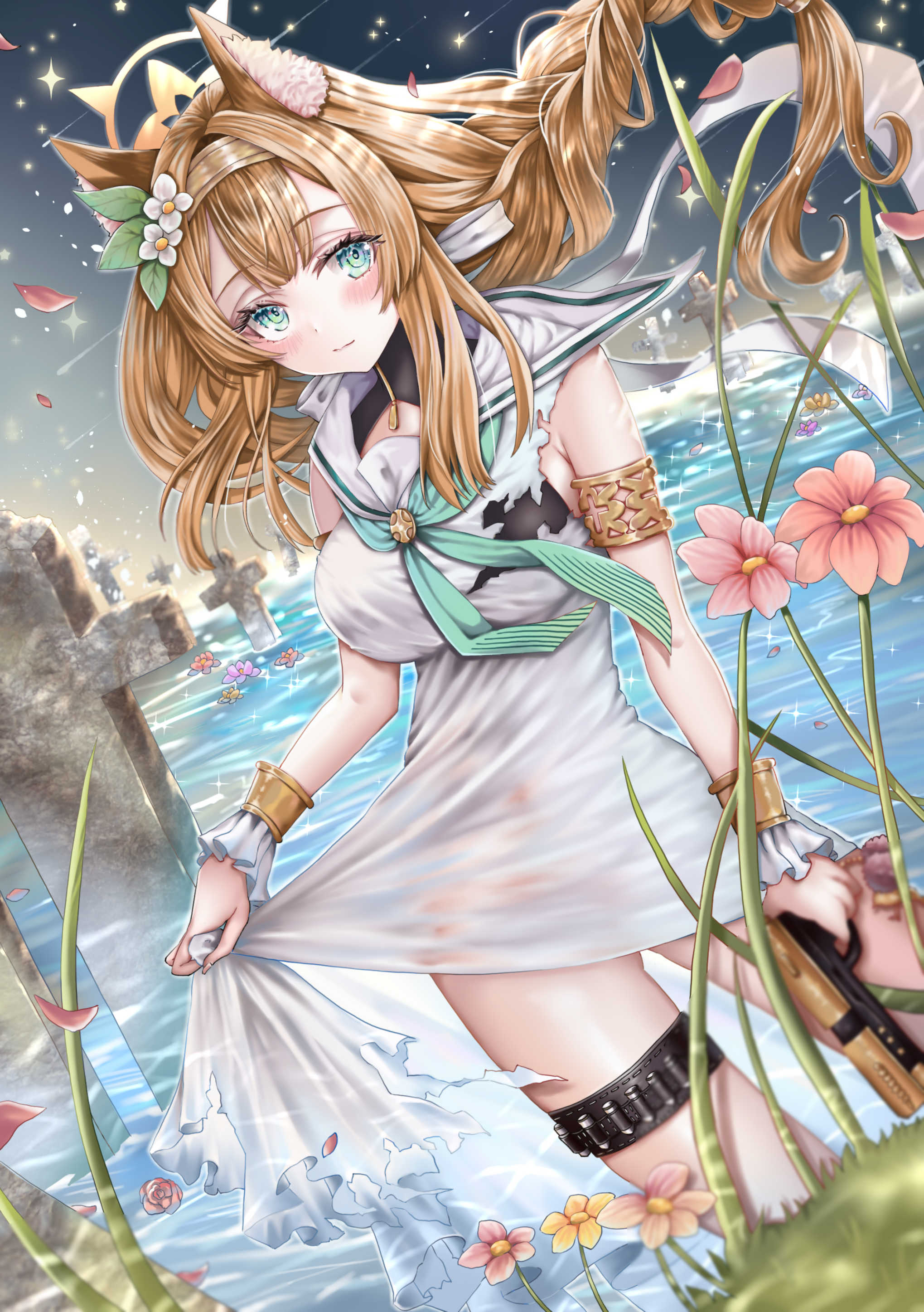 1girlanimal ear fluffanimal earsaqua neckerchiefbare armsblue eyesblushbreastsbrown haircat earscat girlclosed mouthdressflowerhair between eyeshair flowerhair ornamenthairbandhalolong hairlooking at viewerneckerchiefsailor collarsidelockssmilesolothigh straptorn clothestorn dresswaterwetwet clotheswet dresswhite flowerwhite sailor collarwrist cuffsyellow hairbandyellow halo