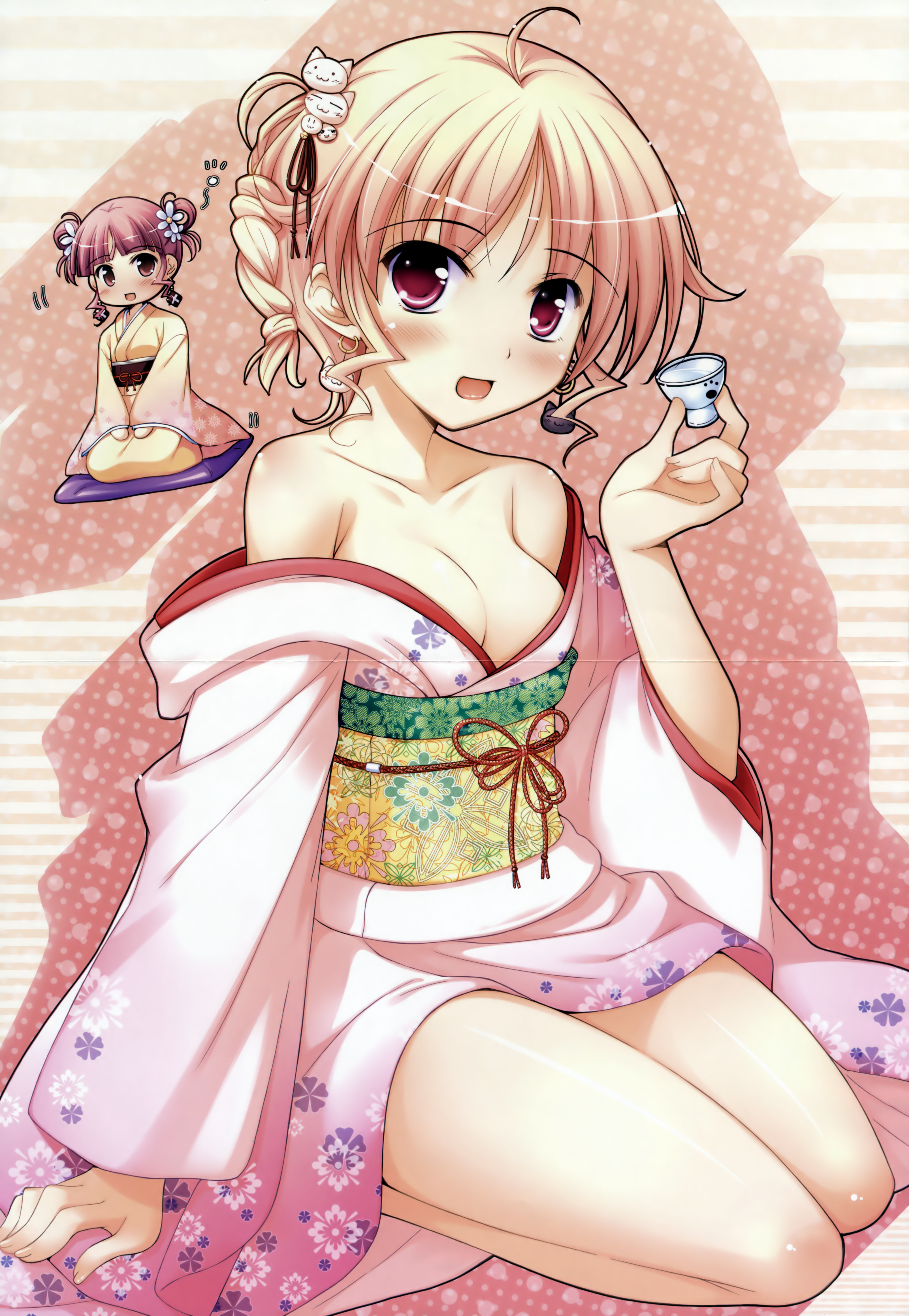 2girlsalcoholbare shouldersblonde hairblushbreastscleavageflowerhair flowerhair ornamenthair upjapanese clotheskimonokneelingmultiple girlsno braoff shoulderpink eyespink hairpurple eyespurple hairsake