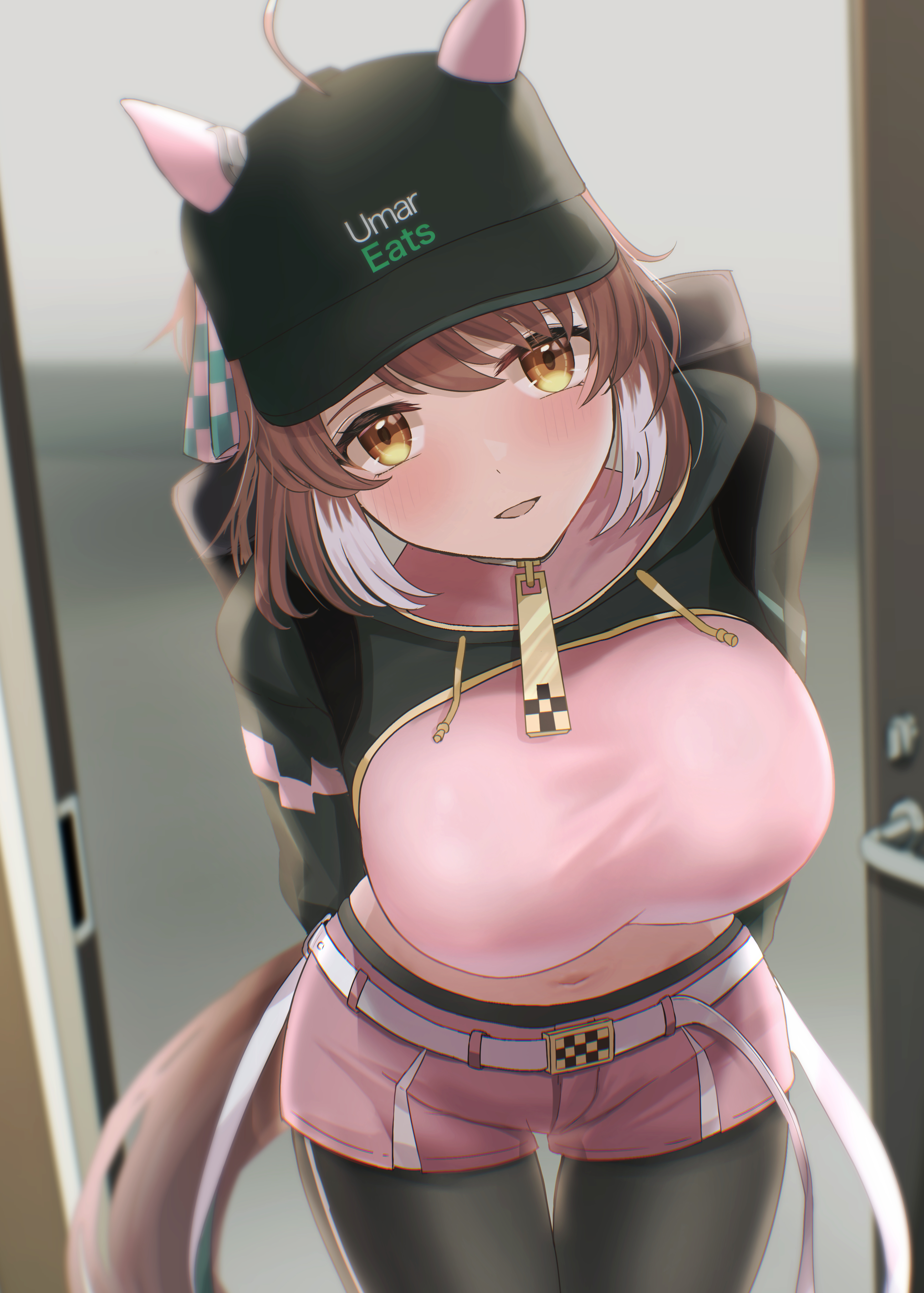 1girlahogeanimal earsarms behind backblack hatbreastsbrown hairear coversears through headwearhathorse earshorse girlhorse taillarge breastslong sleeveslooking at viewermidriffmulticolored hairnavelpantyhosepink shortsshortssmilesolostandingtailtwo-tone hairwhite hair
