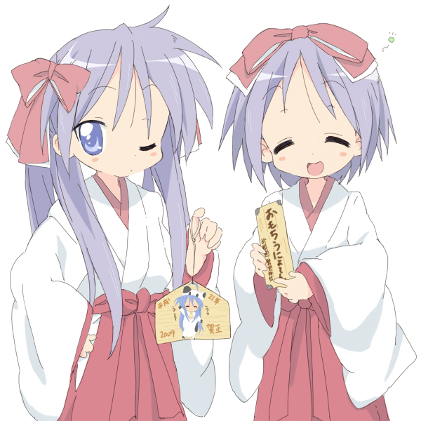 00s1boy2girlsblue eyesclosed eyeshakamahakama skirtjapanese clothesmikomultiple girlsone eye closedpurple hairred hakamasiblingssistersskirttwinsupper bodywink
