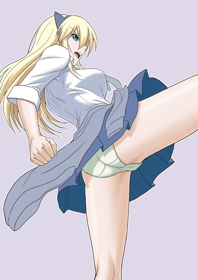 1girlanimal earsblonde hairblue eyesbreastscat earscat girlfemale focushigh kickkickinglong hairpantiespantyshotsimple backgroundskirtsleeves rolled upsolounderwear
