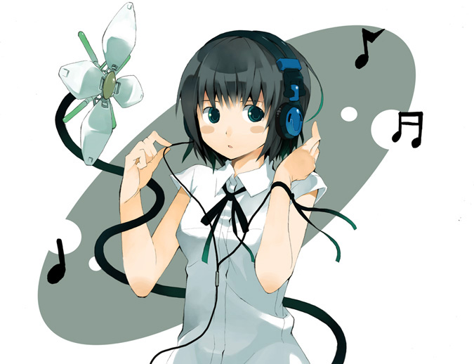 1girlblack hairblue dressblue eyesblushdressfemale focusheadphoneslooking at viewermusical noteshort hairshort sleevessimple backgroundsoloupper bodywhite background