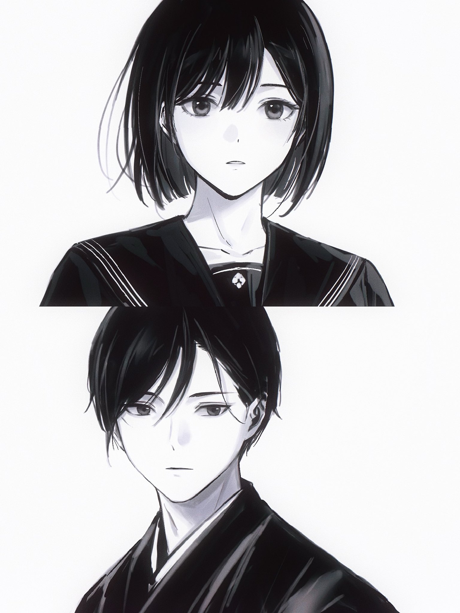 1boy1girlblack hairblack robeblack sailor collarblack serafukublack shirtfacial scargreyscalehair between eyesjapanese clotheslooking at anothermonochromeparted lipsrobesailor collarscarscar on cheekscar on faceschool uniformserafukushirtshort hairupper bodywhite background