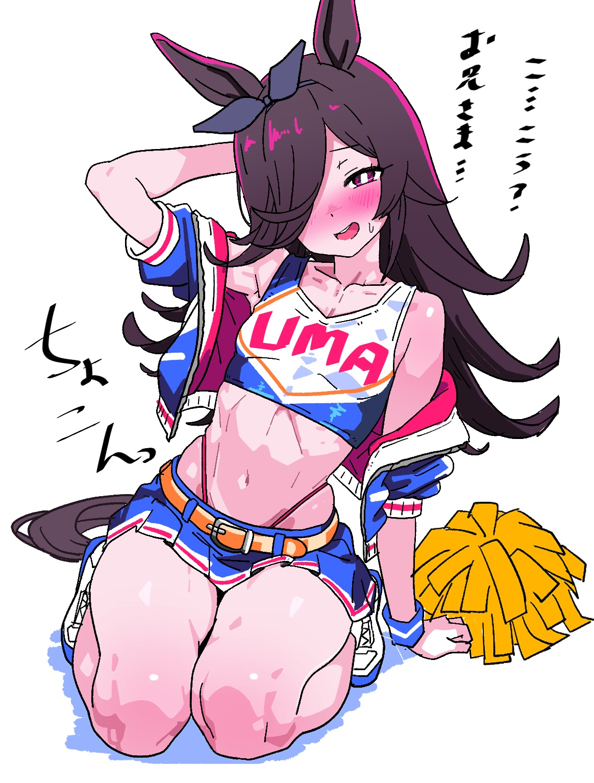 1girlanimal earsarm behind headbare shouldersblack hairblack ribbonblue jacketblue skirtblushcheerleaderhair over one eyehair ribbonhighleghighleg pantieshorse earshorse girlhorse tailjacketkneelinglong hairminiskirtnavelopen clothesopen jacketopen mouthpantiesred eyesribbonshoesskirtsneakerssolosports brastomachsweatdroptailteethunderwearupper teeth onlywhite shoeswhite sports bra