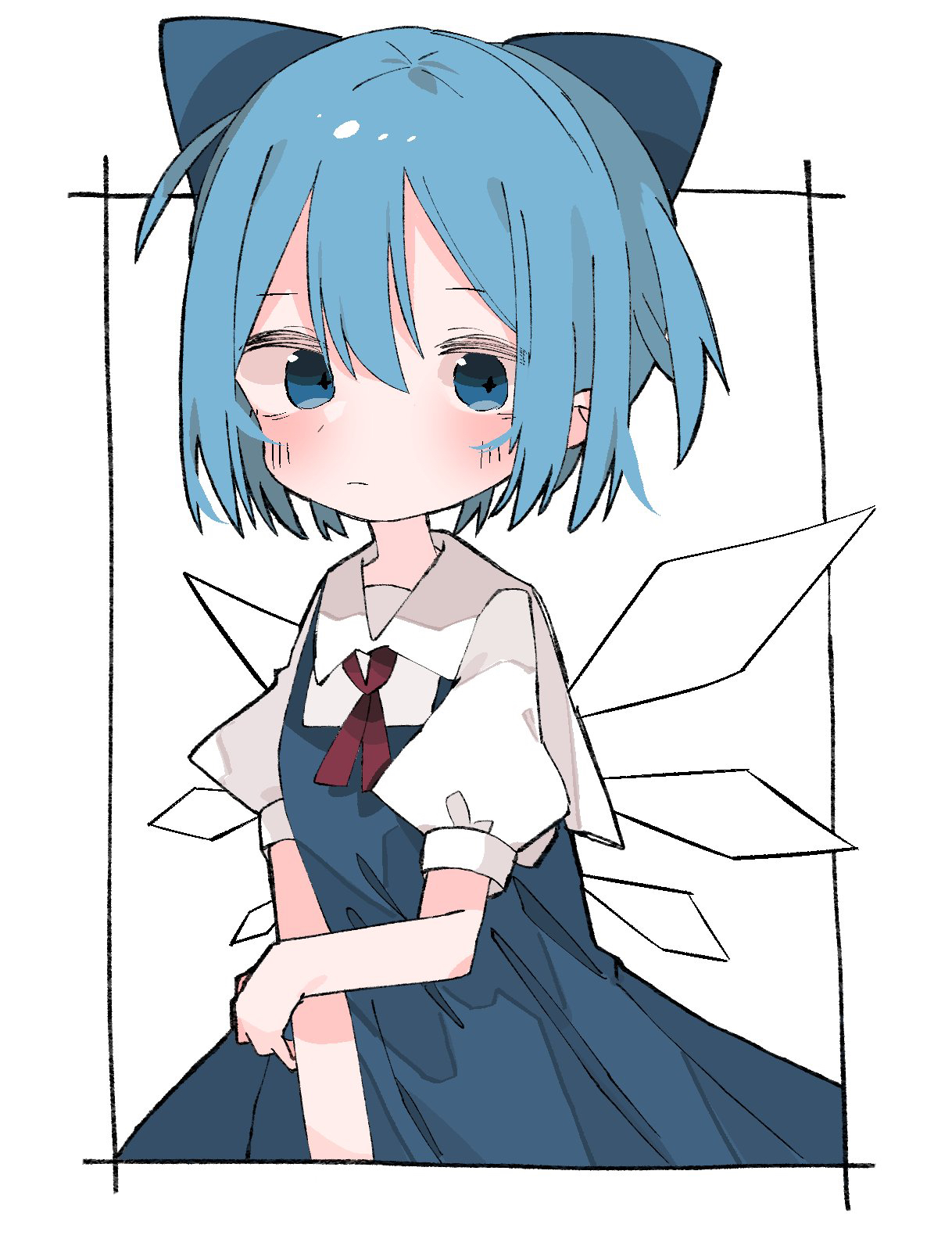1girlbare armsblue bowblue dressblue eyesblue hairblushbowcollared shirtdetached wingsdouble-parted bangsdressfairyhair bowlooking at viewermultiple wingsneck ribbonpinafore dresspuffy short sleevespuffy sleevesred ribbonribbonshirtshort hairshort sleevessimple backgroundsleevelesssleeveless dresssolowhite backgroundwhite shirtwings