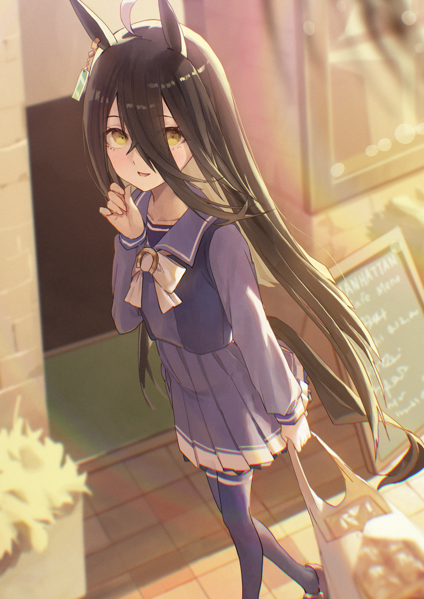 1girlanimal earsbacklightingbagblack hairblack tailbowbowtieear ornamentearringshair between eyesholdingholding baghorse earshorse girlhorse tailhorseshoe ornamentjewelrylong hairlong hair between eyeslong sleeveslooking at viewermenu boardopen mouthplastic bagpurple shirtpurple skirtpurple thighhighsschool uniformshirtsingle earringskirtsmilesolostandingtailthighhighstracen school uniformwhite bowwhite bowtieyellow eyes